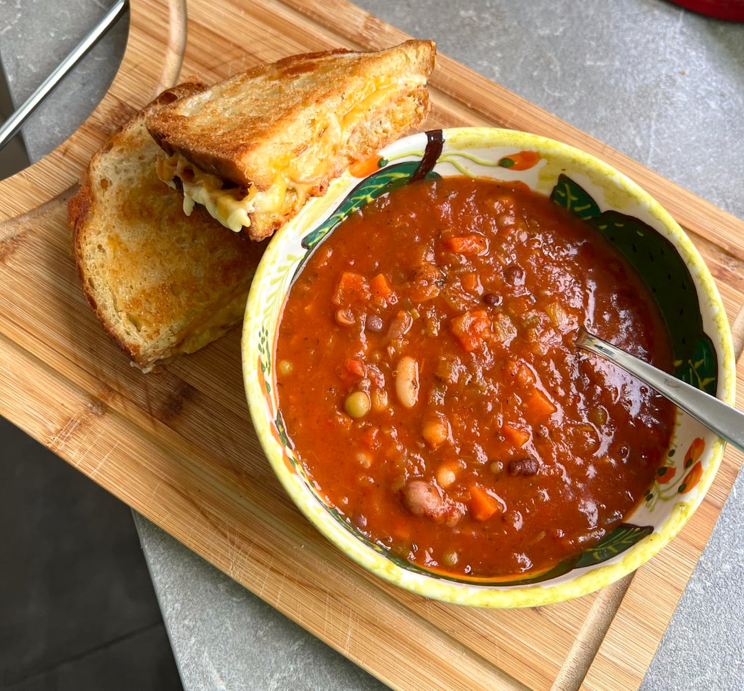 Tomatensuppe mit Hülsenfruchtmix und Grilled cheese aus selbstgemachtem Brot