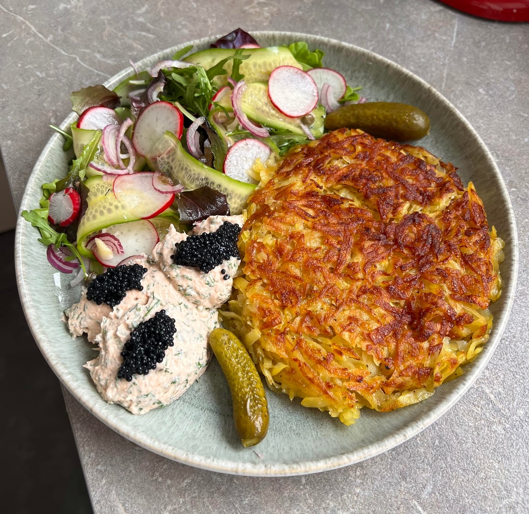 Rösti, Salat, Kaviar und Lachs-Meerrettichcreme