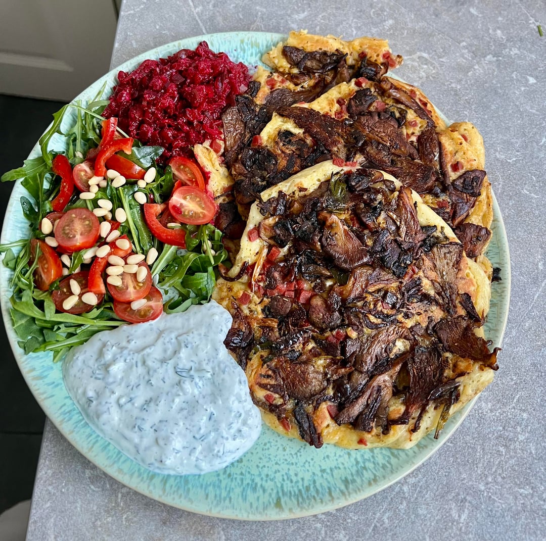 Hefepfannkuchen mit Pilzen und Speckwürfeln, Salat, Dill-Knoblauchdip und Rote Beete-Meerrettich-Gürkchensalat