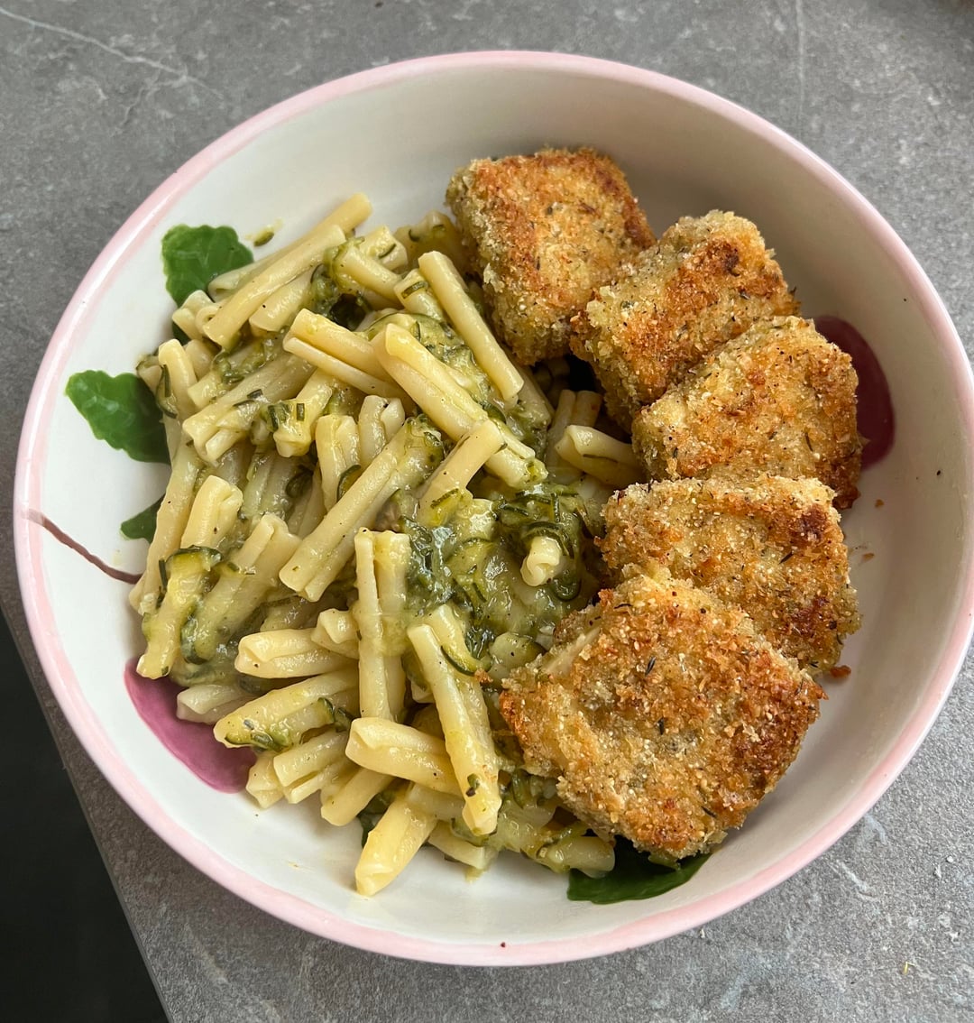 - Zucchinipasta mit Tofu in Parmesan-Kräuter-Zitronenpanade