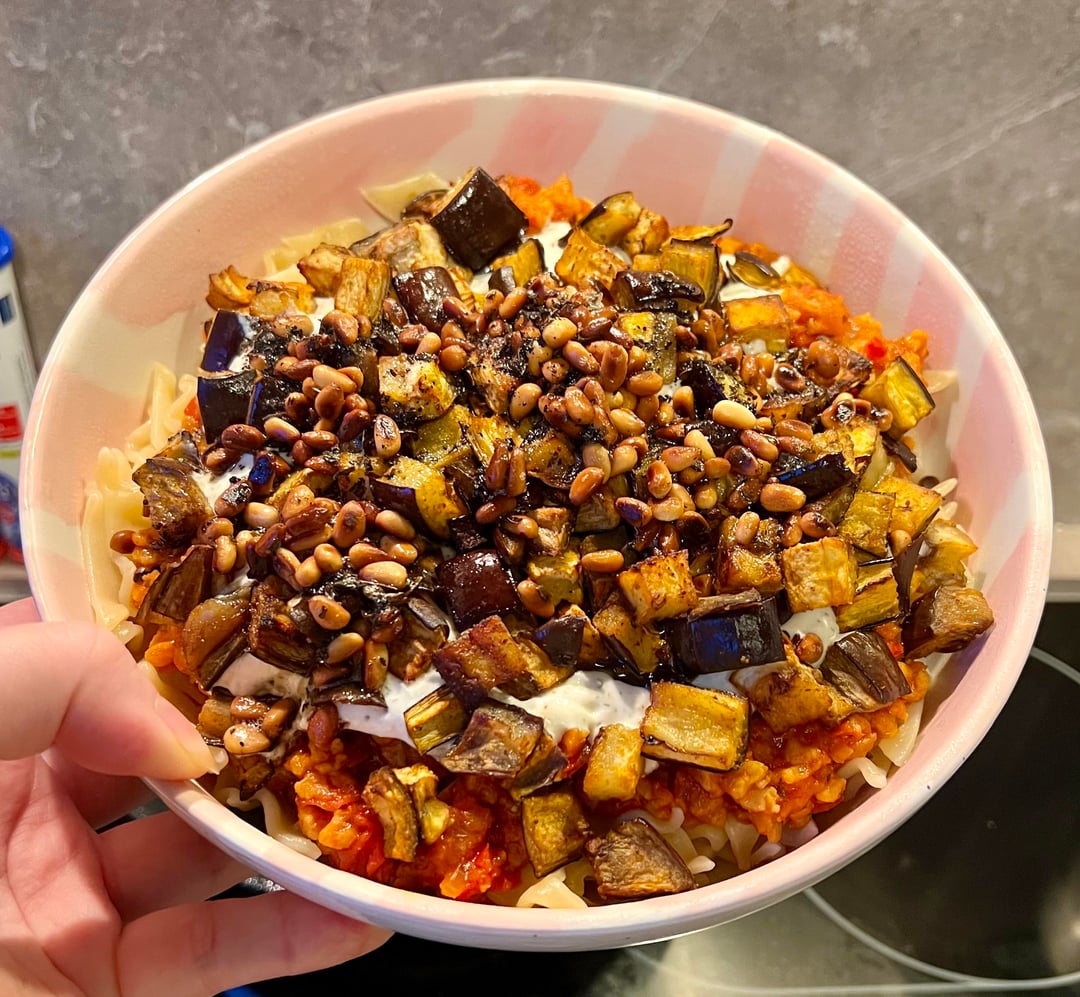 Türkische Pasta mit Auberginen und Minz-Pinienkernbutter
