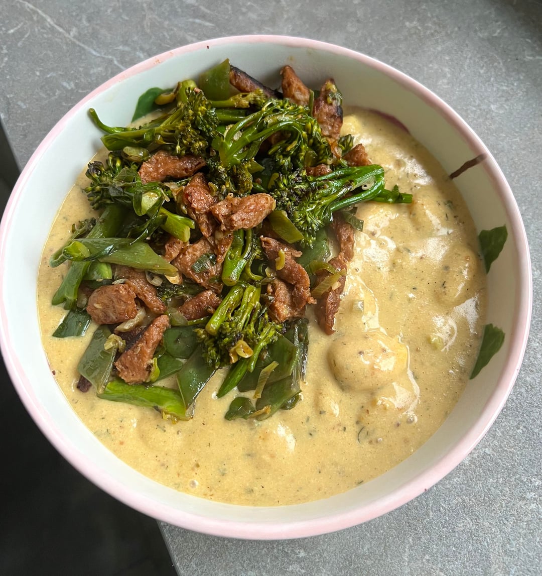 Gnocchi in viel zu viel Jalapeño-Käsesoße mit Gemüse und Sojaschnetzeln in Gochujangmarinade
