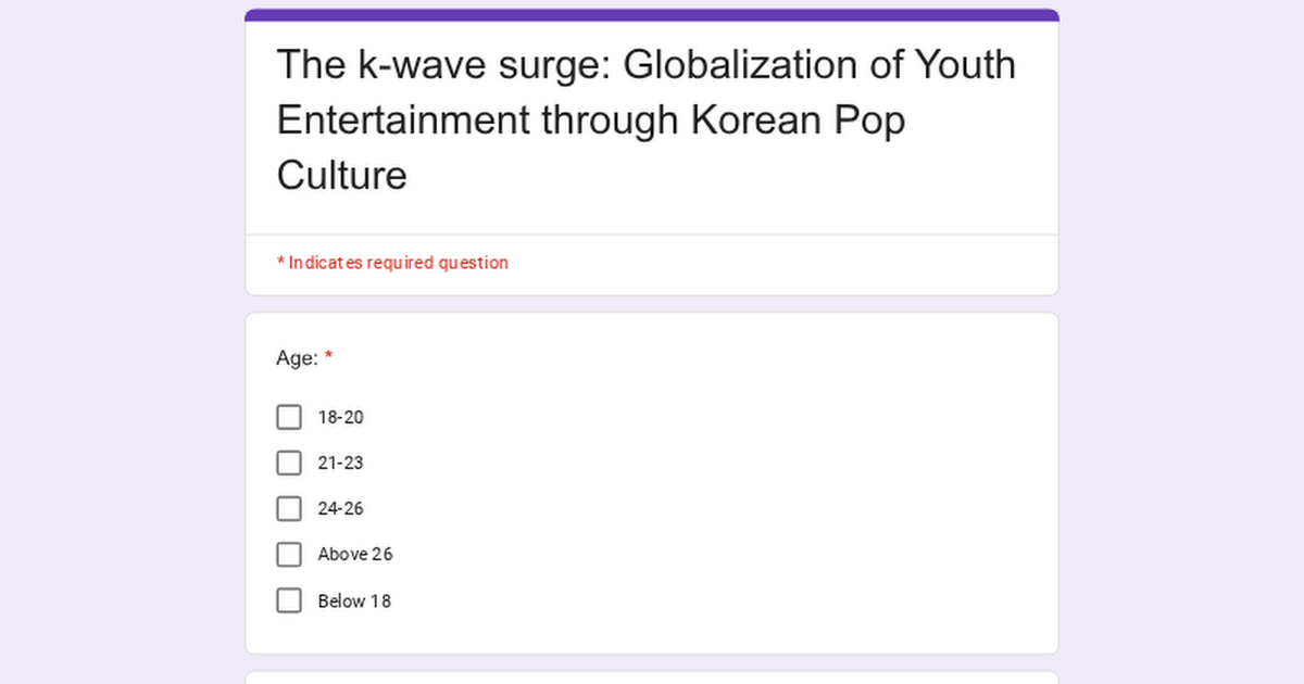 Hallo !! Ich arbeite an einem K-Pop-Forschungsprojekt und es fehlen noch ein paar Antworten zu meinem Ziel. Wenn Sie 5 Minuten Zeit haben, wäre ich Ihnen sehr dankbar, wenn Sie dieses Formular über den kulturellen Wandel von K-Pop ausfüllen könnten.