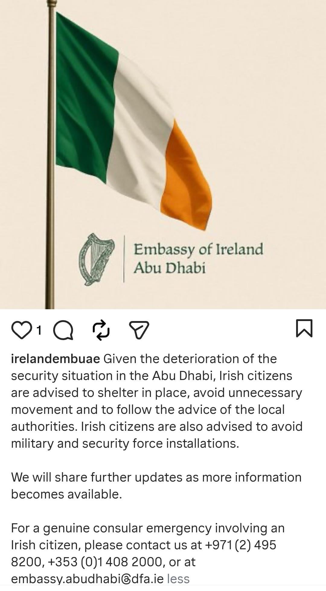 Bleiben Sie alle gesund. Wenn Sie sich derzeit im Nahen Osten aufhalten und dies noch nicht getan haben, registrieren Sie sich bitte auf dem Bürgerregistrierungsformular des DFA, damit die Botschaft weiß, dass Sie sich hier befinden: