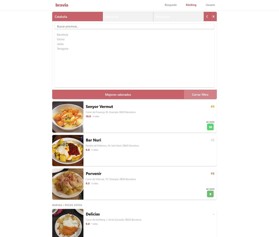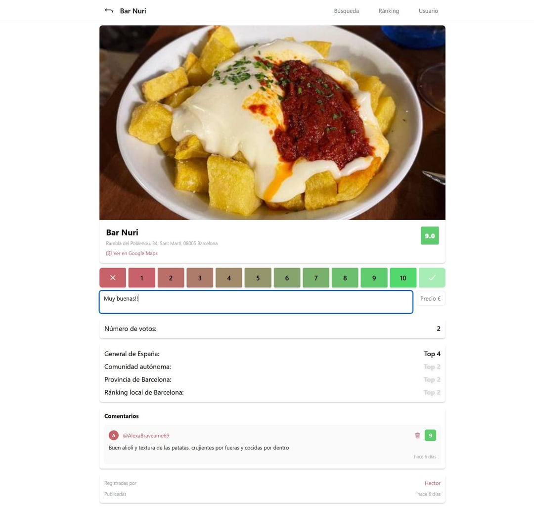 Bravas-Kartoffeln sind mein Lieblingsessen und ich habe schon immer gerne verschiedene Riegel probiert. Vor 4 Jahren habe ich LQSA gesehen, wo sie die Auszeichnung haben "Der goldene Hummer" Nun, ich habe mir vorgestellt, wie großartig es wäre, dies zu gewähren "Der goldene Tapfere". Es gibt Leute wie bravasbarcelona mit einer sehr guten Liste, aber nur aus Barcelona und Umgebung. Als Filmliebhaber liebe ich FilmAffinity, also dachte ich, ich könnte es tun "die Filmaffinität der Bravas-Kartoffeln" und dass jeder wählen konnte.