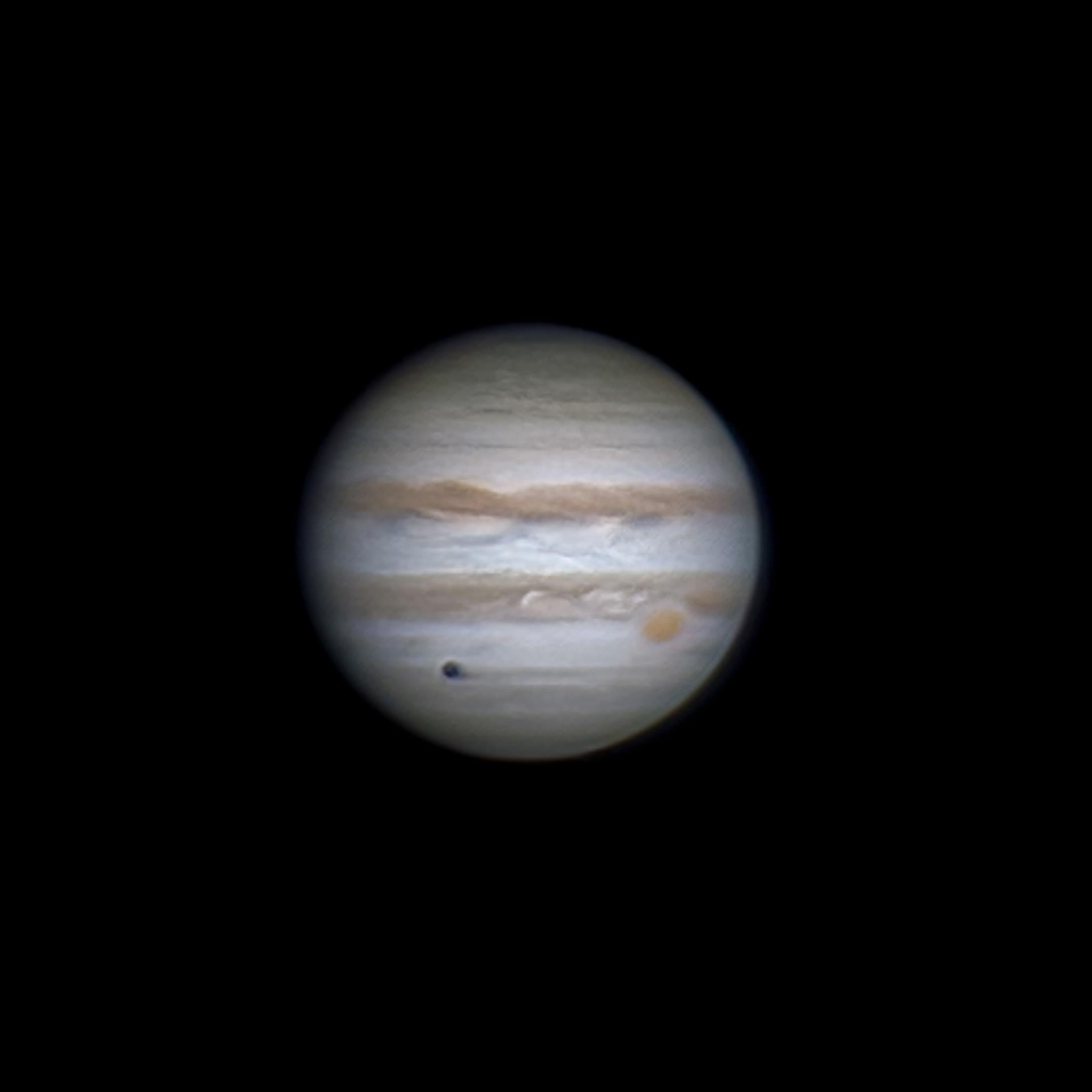 Ich habe letzte Nacht Jupiter eingefangen und den Transit von Callisto, einem seiner galiläischen Monde, miterlebt. Kallisto vor den wirbelnden Wolken des Jupiter auf der einen Seite und dem Großen Roten Fleck auf der anderen Seite.
