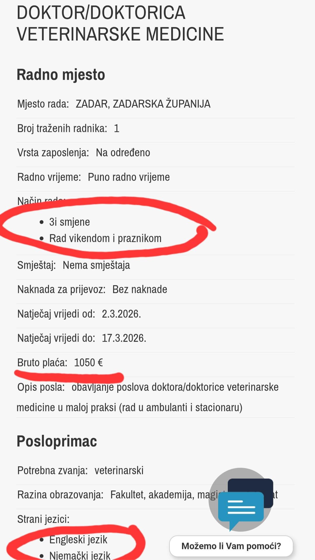 2. Smjene nisu toliko upitne tu, mnogi rade za puno manje takve smjene. Ali 1050 eur s diplomom veterinara?? Mozda prije 10 godina.