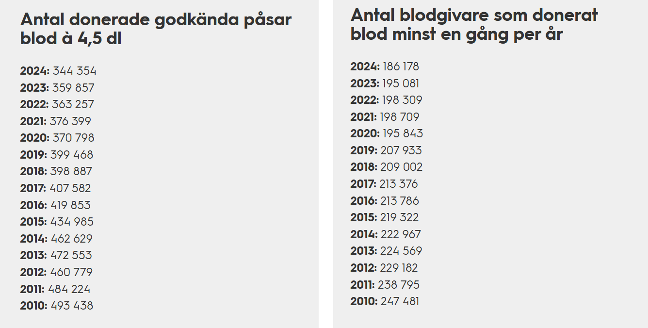 Jag tror att fler hade blivit blodgivare om man hade fått någon slags förtur om man själv behöver blod i framtiden, det är väl också så att man är lite rädd för ev. biverkningar som kan komma. Plus är det ändå inte alla som „orkar“ ta sin tid för att boka tid och sedan ta sig dit för att ge blod