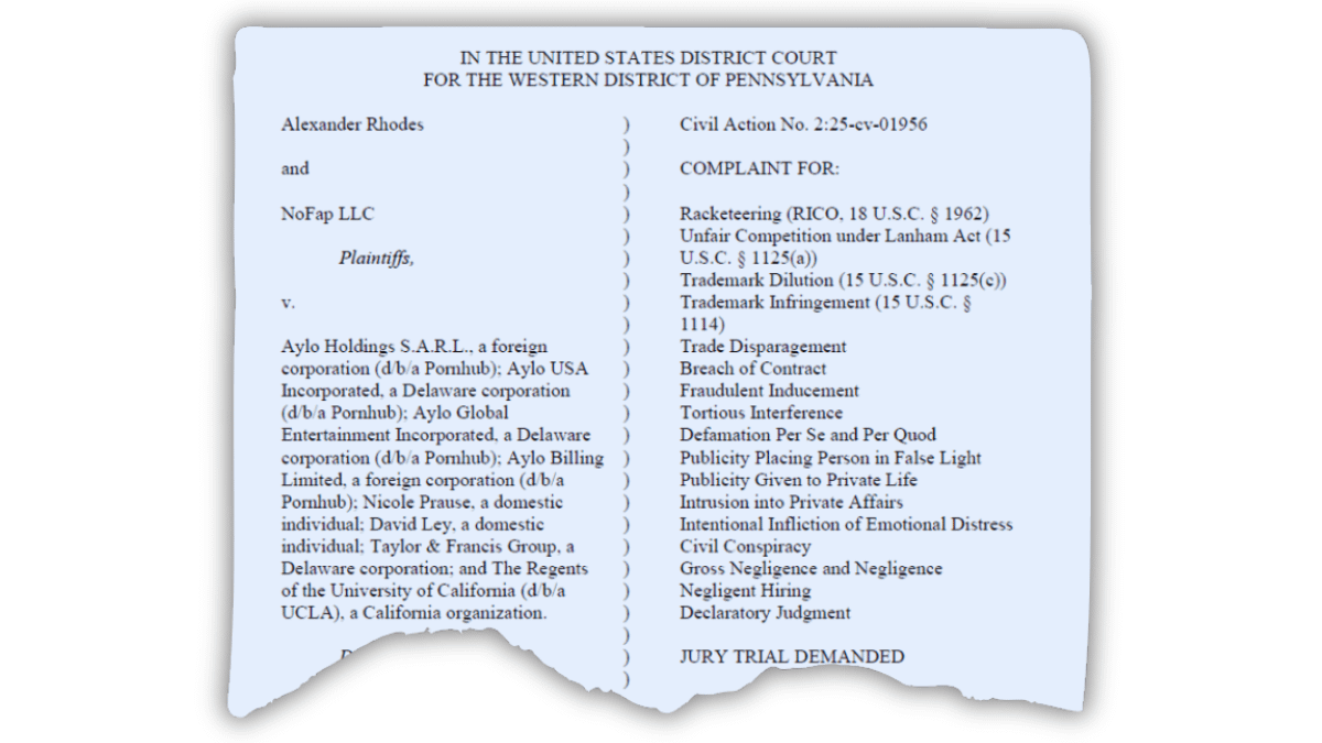 NoFap (Anti-Porno-Gruppe) und der Gründer der Gruppe, Alexander Rhodes, verklagten Taylor & Francis und einen UCLA-Forscher wegen eines kritischen Artikels über die Gruppe