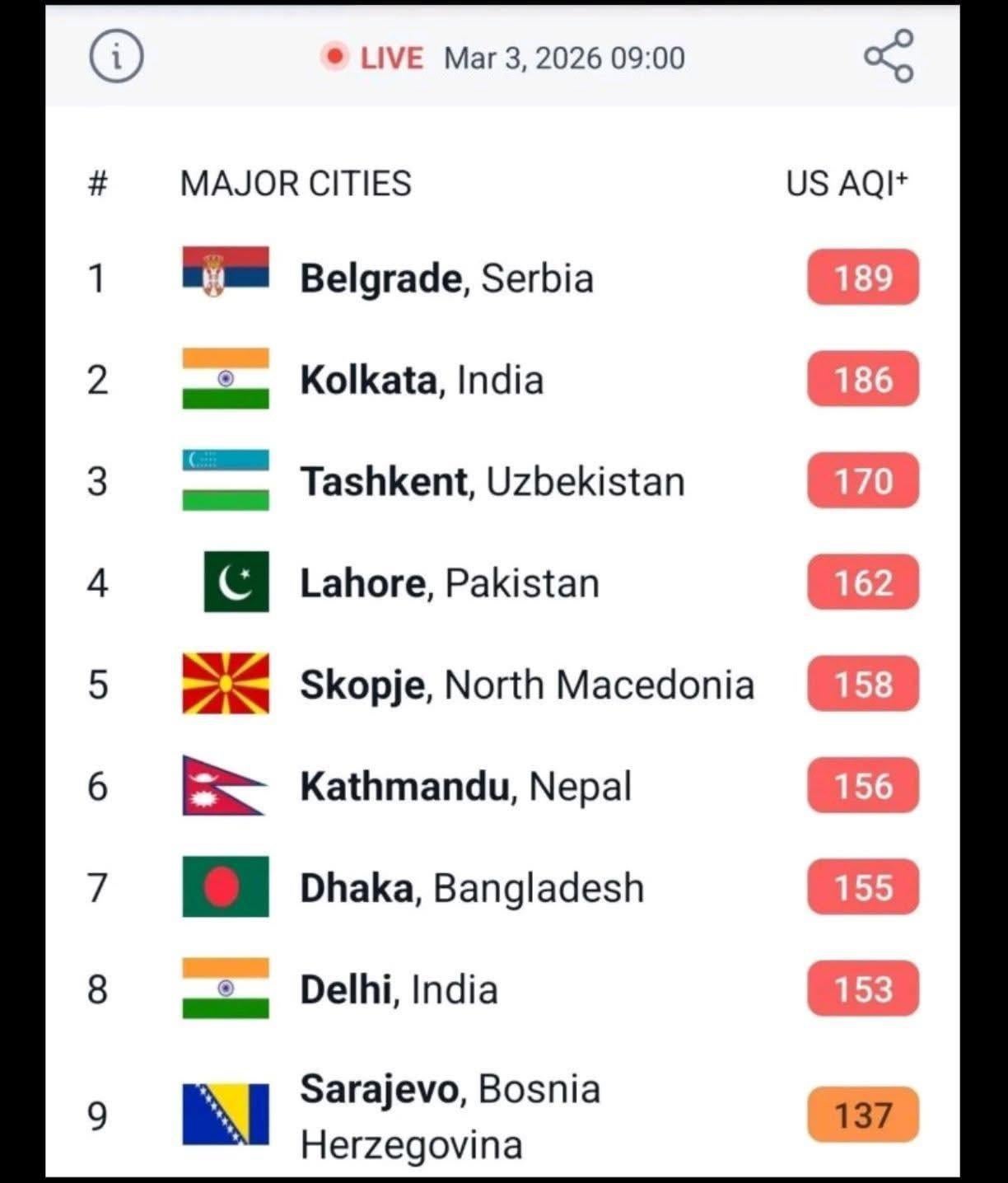 Samo da podsetim da je u Beogradu 9 ujutru, a u Kolkati 1:30 popodne. US AQI, kao i druga merila zagađenja, menja vrednost tokom dana. Zapravo, ovako smo uhvatili Beograd pri vrhuncu svog zagađenja, i Kolkatu pri dnu svog. Ispravno bi bilo da poredimo BG kad je jutro u Beogradu i Kolkatu kad je jutro u Kolkati, gde je skoro bilo 275. Ne znači da je BG ko zna kako čist, ali znači da poređenje ne valja. Bolje je porediti sa Budimpeštom ili Bečom, ipak su to daleko bliži i sličniji gradovi, i poređenja nisu podložna ovakvim greškama.