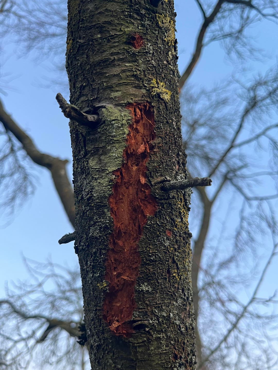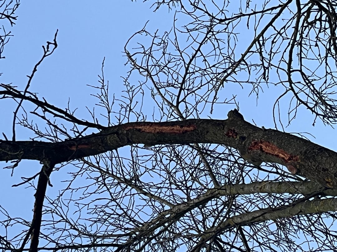 Wenn ich mir die Höhe und Risse in den Ästen ansehe, tätet ihr gut dran den schnell runter zu schneiden, nicht dass beim nächsten Sturm oder Schnee der halb runter kommt.