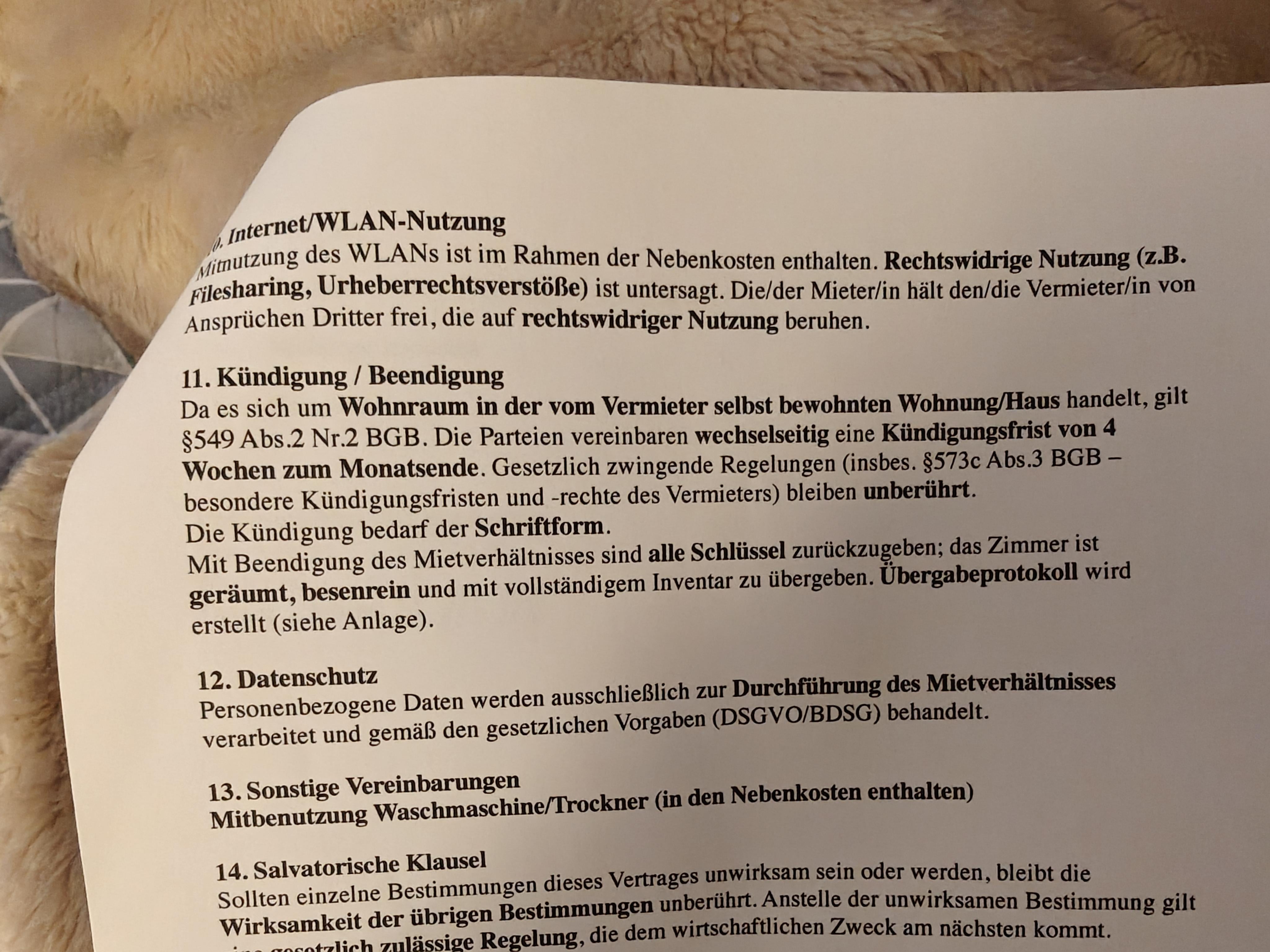 Hallo Leute, ich lebe seit Oktober 2025 als internationaler Student in Deutschland. Mein Vermieter wohnt auch in meiner Unterkunft. Sagen wir einfach, dass es nicht einfach ist, mit ihr zusammenzuleben. Sie gab mir trotz wiederholter Nachfrage nie die Schlüssel zu meinem Zimmer, sie wirft unser Essen in den Müll, sie behauptete einmal, sie hätte meine Mitbewohnerin verprügelt, weil sie seufzte, sie hat Wasser in unser Essen gegossen und es in die Spüle geworfen, sie hat den Kühlschrank ausgesteckt und uns zwei Stunden vorher Bescheid gegeben, aber unser Essen war alle schlecht. Ehrlich gesagt lässt sich die Liste beliebig fortsetzen. Gestern hatte ich endlich meinen Strohhalm, nachdem sie sauer auf uns geworden war, weil wir nicht geputzt hatten (was wir immer tun), und uns gesagt hatte, dass wir die Küche nicht mehr benutzen könnten. Ich beschloss, die Kündigung einzureichen, und in meiner Vereinbarung stand, dass ich sie vier Wochen im Voraus einreichen musste. Ich habe es heute vorgelegt und sie hat es direkt abgelehnt und erklärt, dass es am Ende des Monats abgegeben werden muss und ich nach dem 30. April ausziehen kann. Was mache ich? Ich habe den Teil des Mietvertrags beigefügt, in dem es um die Kündigung geht. Danke schön.