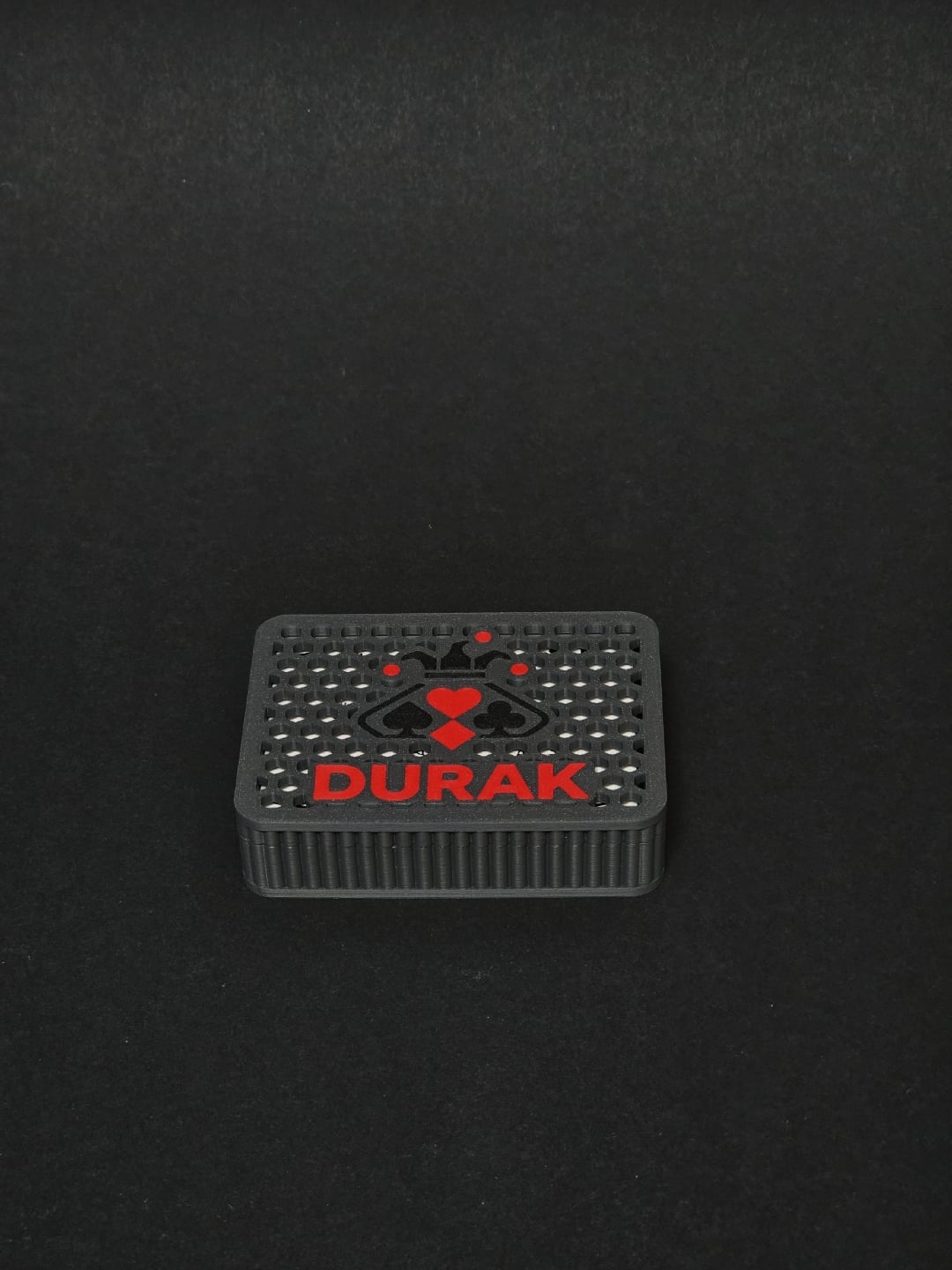 Durak war seit meiner Kindheit mein Lieblingskartenspiel, deshalb habe ich meine eigene Box dafür gemacht. Es bietet Platz für Karten im Standard-Pokerformat und verfügt über einen sicheren Schnappdeckel, der fest schließt. Schlichtes, kompaktes und praktisches Design mit einem Hauch Nostalgie.