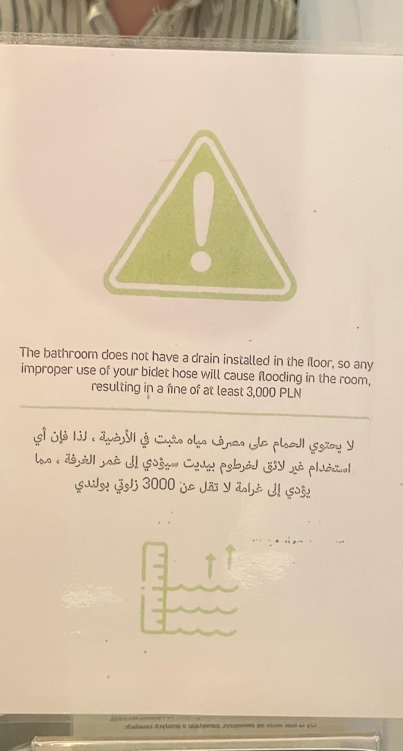 In Middle East you have a drain in every bathroom and every kitchen. The floors are usually washed with pouring water and using a rubber tool to drain it (ściągaczka?). It was very useful when our washing machine broke and flooded the kitchen. I guess the guest may assume it’s the same in Poland. So many times we assume what’s normal in our country would be normal in others. Like a person from Poland would assume all windows in the world tint