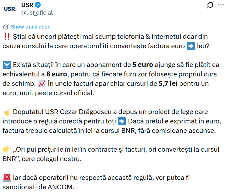 USR-Abgeordneter Cezar Drăgoescu legte eine Rechnung vor. Wenn der Preis in Euro angegeben ist, muss die Rechnung in Lei zum BNR-Kurs ohne versteckte Provisionen berechnet werden. „Sie geben die Preise entweder in Verträgen und Rechnungen in Lei an oder Sie rechnen zum BNR-Kurs um.“