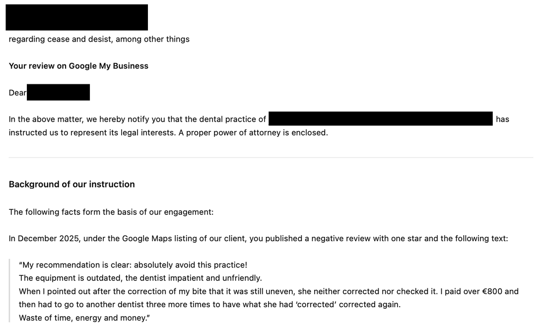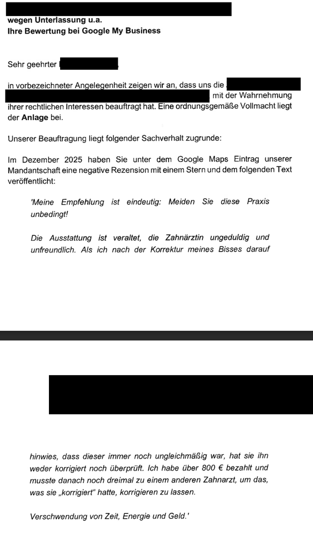 Kontext: Hatte eine sehr unterdurchschnittliche Erfahrung beim Zahnarzt, schrieb eine ehrliche Bewertung, sie wurde auf Google Maps gemeldet, Google bewies, dass sie wahr war. Es vergehen einige Monate – ich erhalte eine Unterlassungserklärung von Anwälten, in der es heißt, ich solle die Bewertung bis zum X-Datum entfernen, sonst muss ich mit einer Klage in Höhe von 20.000 € rechnen. Kein Wunder, dass die Praxis auf Google Maps eine hervorragende Bewertung hat.