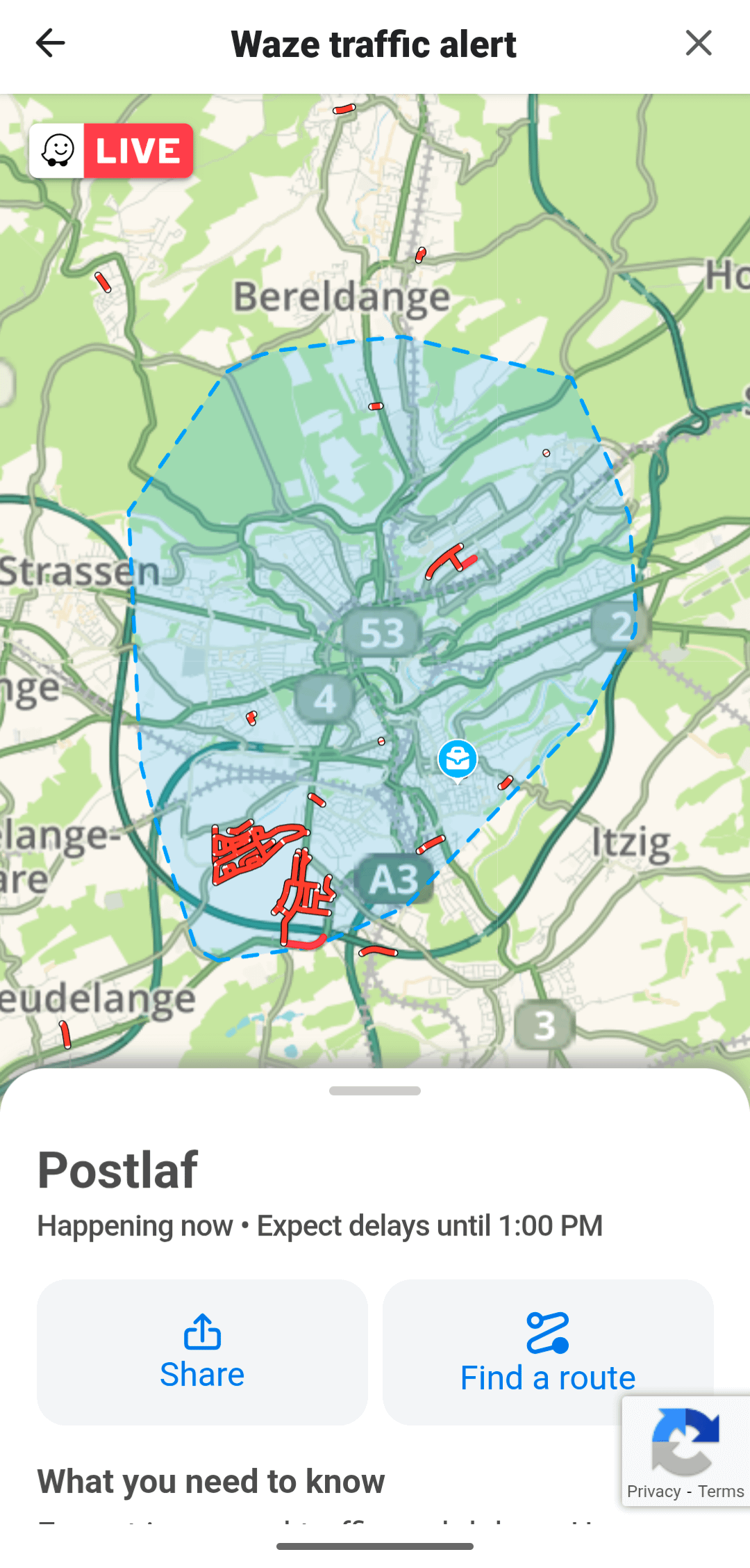 Ich habe in der Waze-App eine Benachrichtigung erhalten, dass heute ein Postlaf (Postdienst?) läuft.