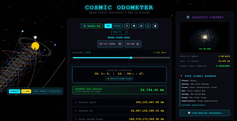 1. I’ve always struggled to intuitively grasp the true scale of the universe, so I built an interactive dashboard to calculate our continuous lifetime path length through the cosmos based on birth date and latitude.
