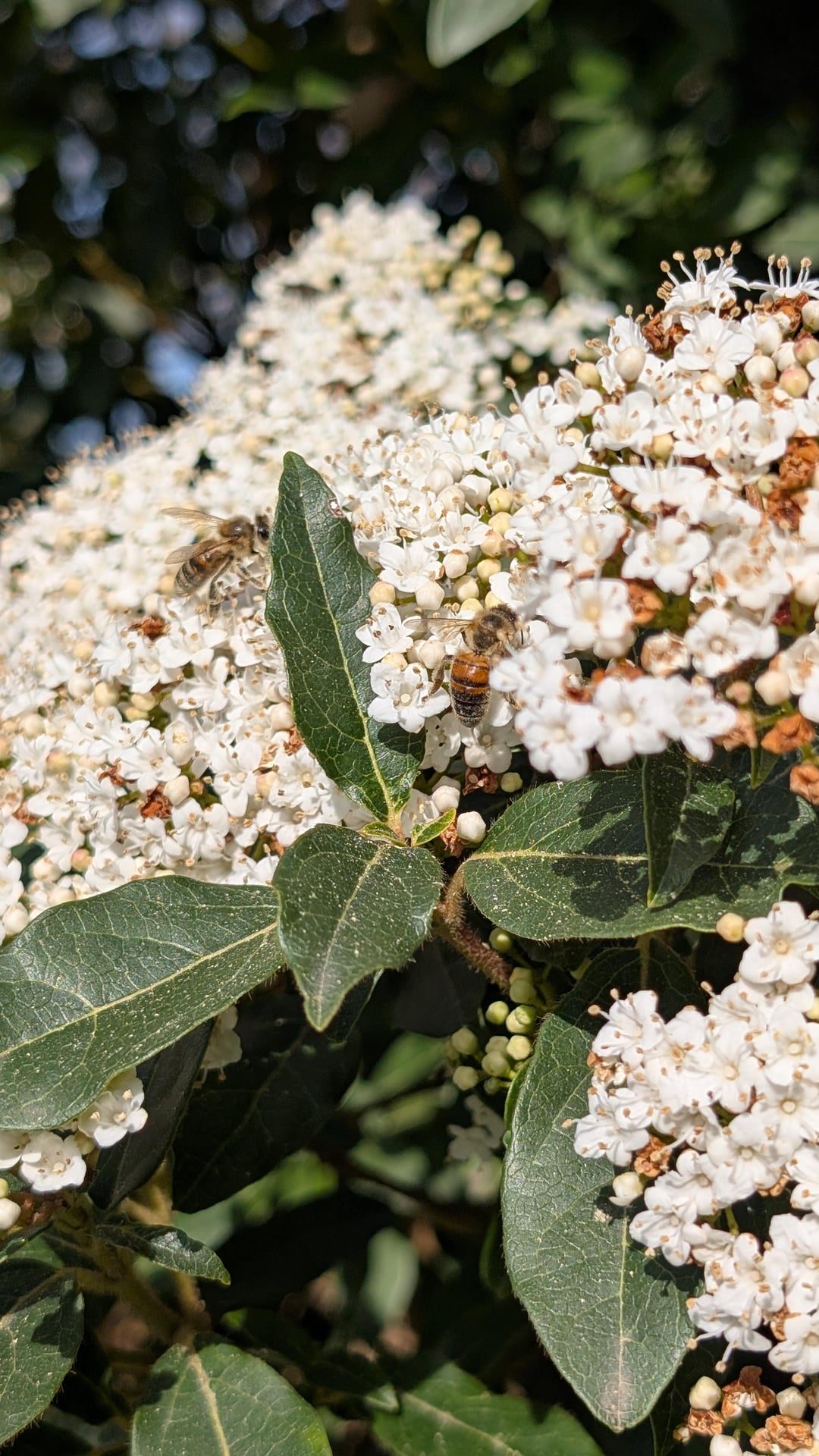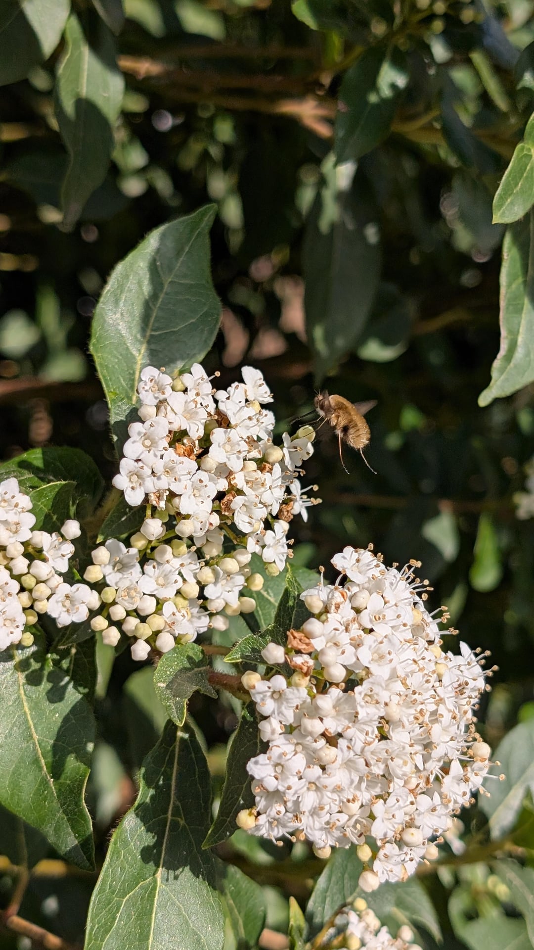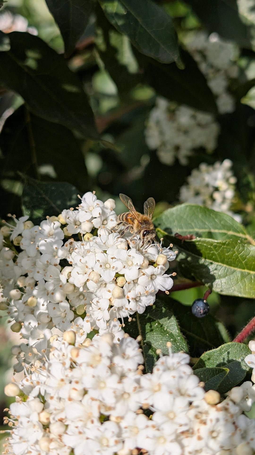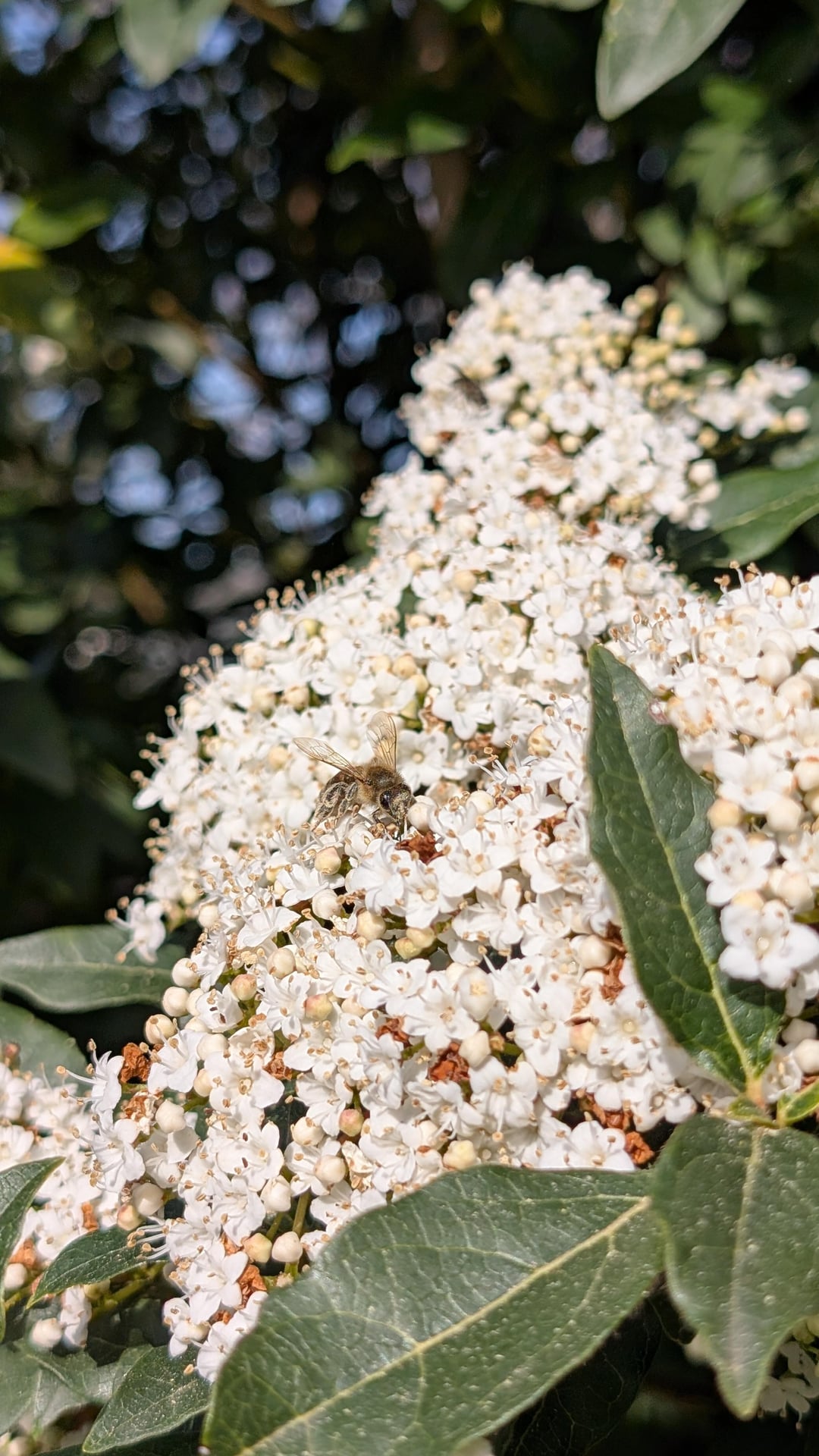 Die das größte Geschenk gibt es aber schon jetzt: der Lorbeer Schneeball steht in voller Blüte und es wimmelt nur so von Bienen! Es summt und brummt wie verrückt in der Ecke.