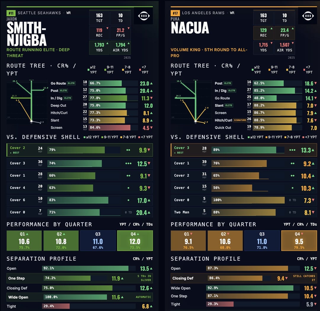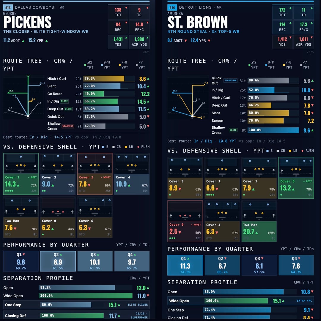 They look really well done. Not sure what I would care about a route tree in fantasy football though. Maybe you should do this more for college players that are going to get drafted. I could see this info being more pertinent for that.