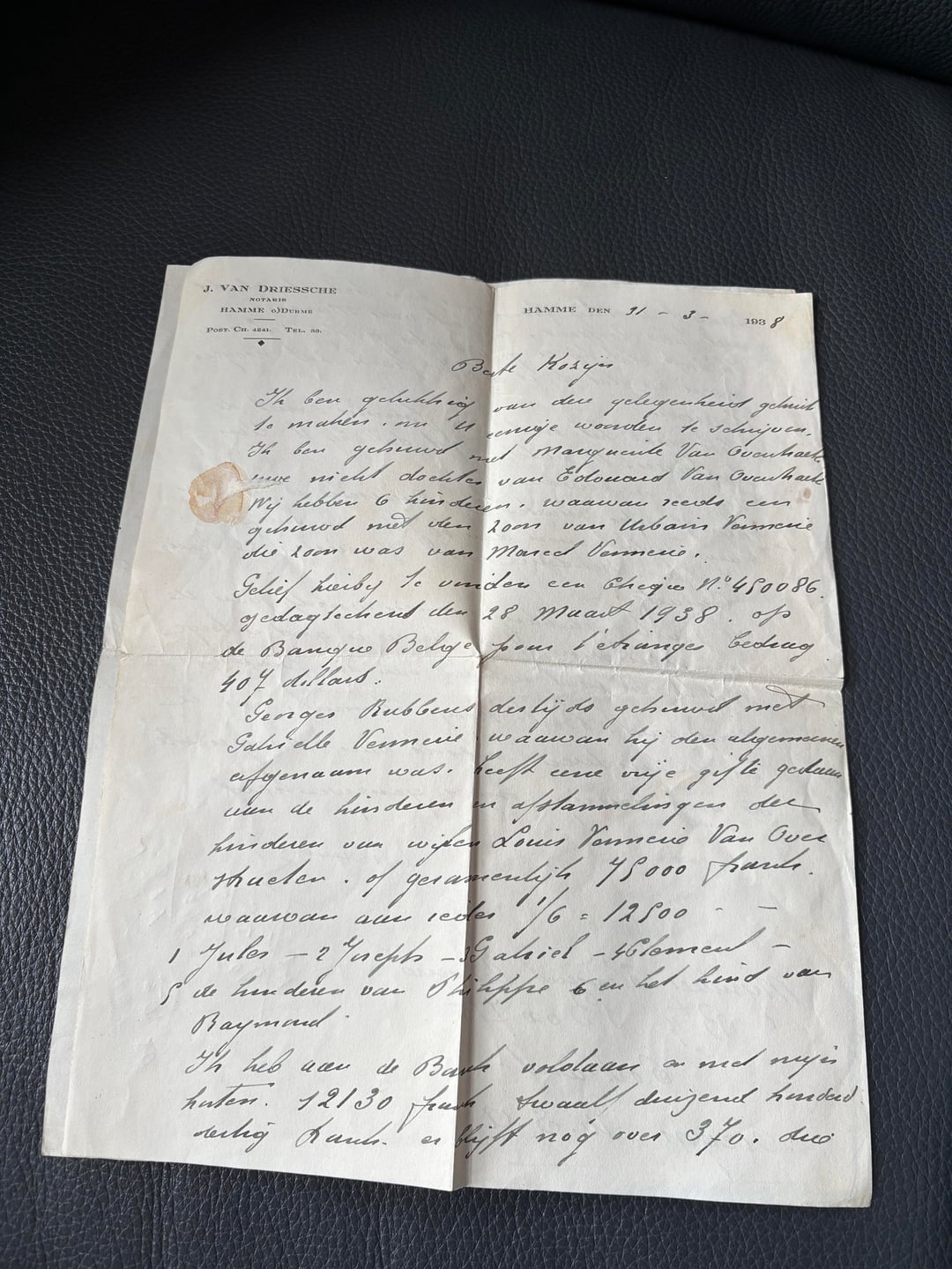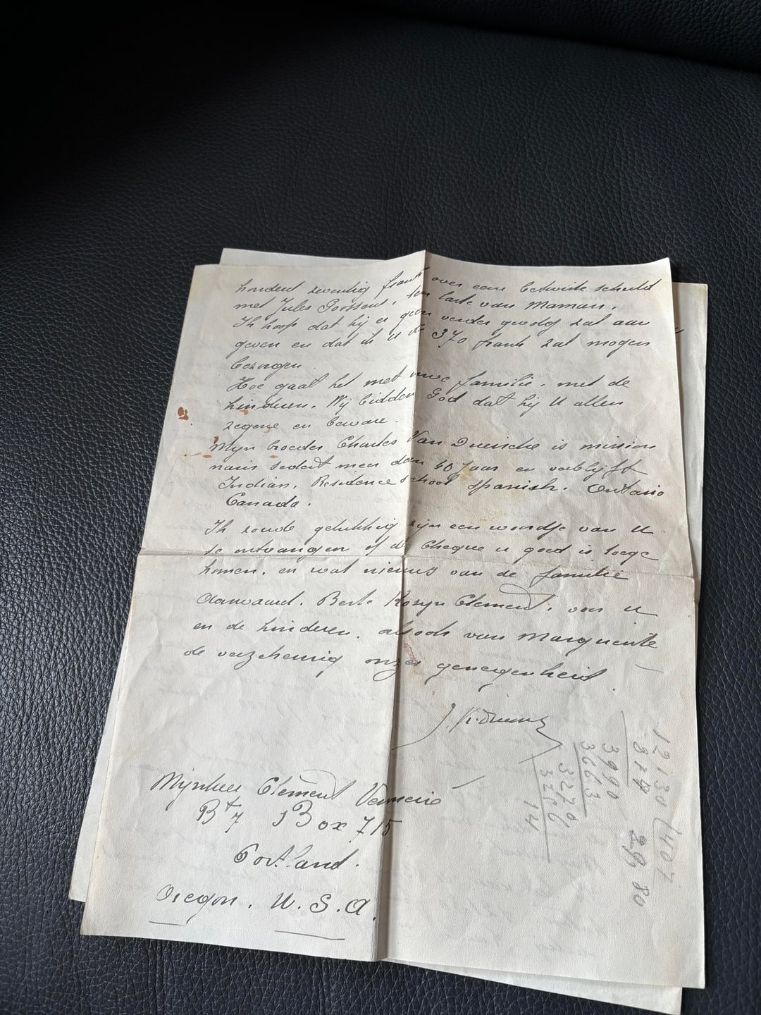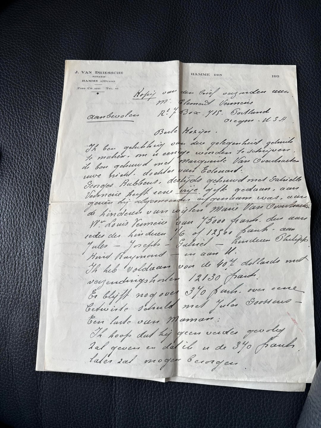 I’ve looked at the letters diagonally, and it seems to be correspondence between family members (dear cousin). Something about dollars and francs. I see Canada mentioned and Oregon. Without having read in detail, looks like some family members emigrated to the US or Canada and they’re sending back money. The town in Belgium is „[Hamme](https://maps.app.goo.gl/83Z5azwWhnDLDjoC8)“. I’ll try to transcribe tomorrow.