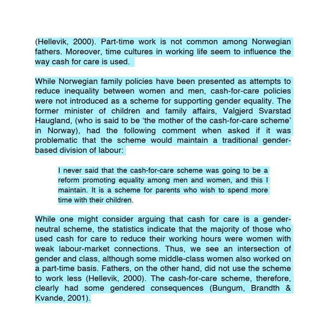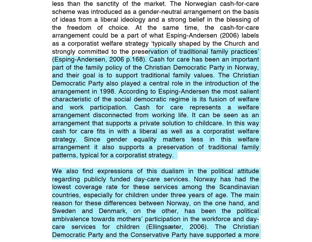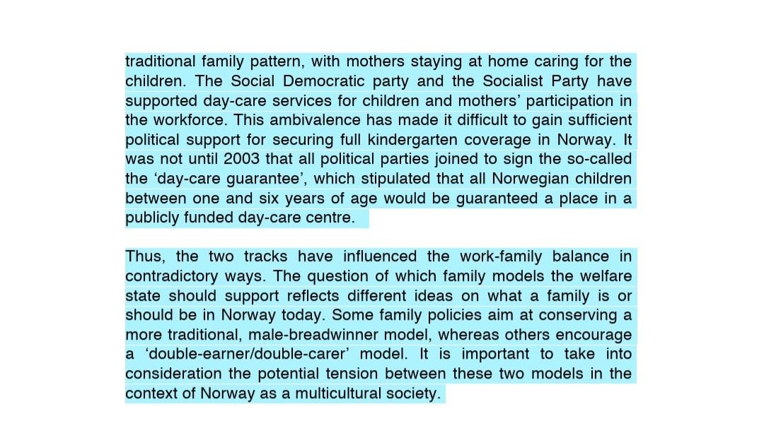 Eine Studie, die ich gefunden habe, heißt jedoch: "Der Aufstieg und Fall des Pflegegeldes in Norwegen: Veränderungen in der Nutzung von Kinderbetreuungsmaßnahmen" behauptet, dass dies die Geschlechterrollen stärkt und von Frauen trotz der geschlechtsneutralen Absicht meist genutzt wird.
