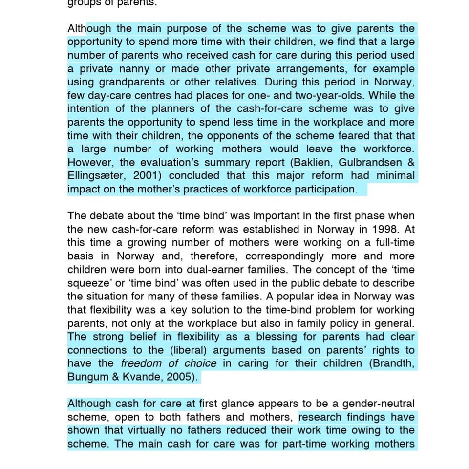 > However, a study I found called: „The rise and fall of cash for care in Norway: changes in the use of child-care policies“ claims this reinforces gender roles and is used by women mostly despite the gender neutral intention.