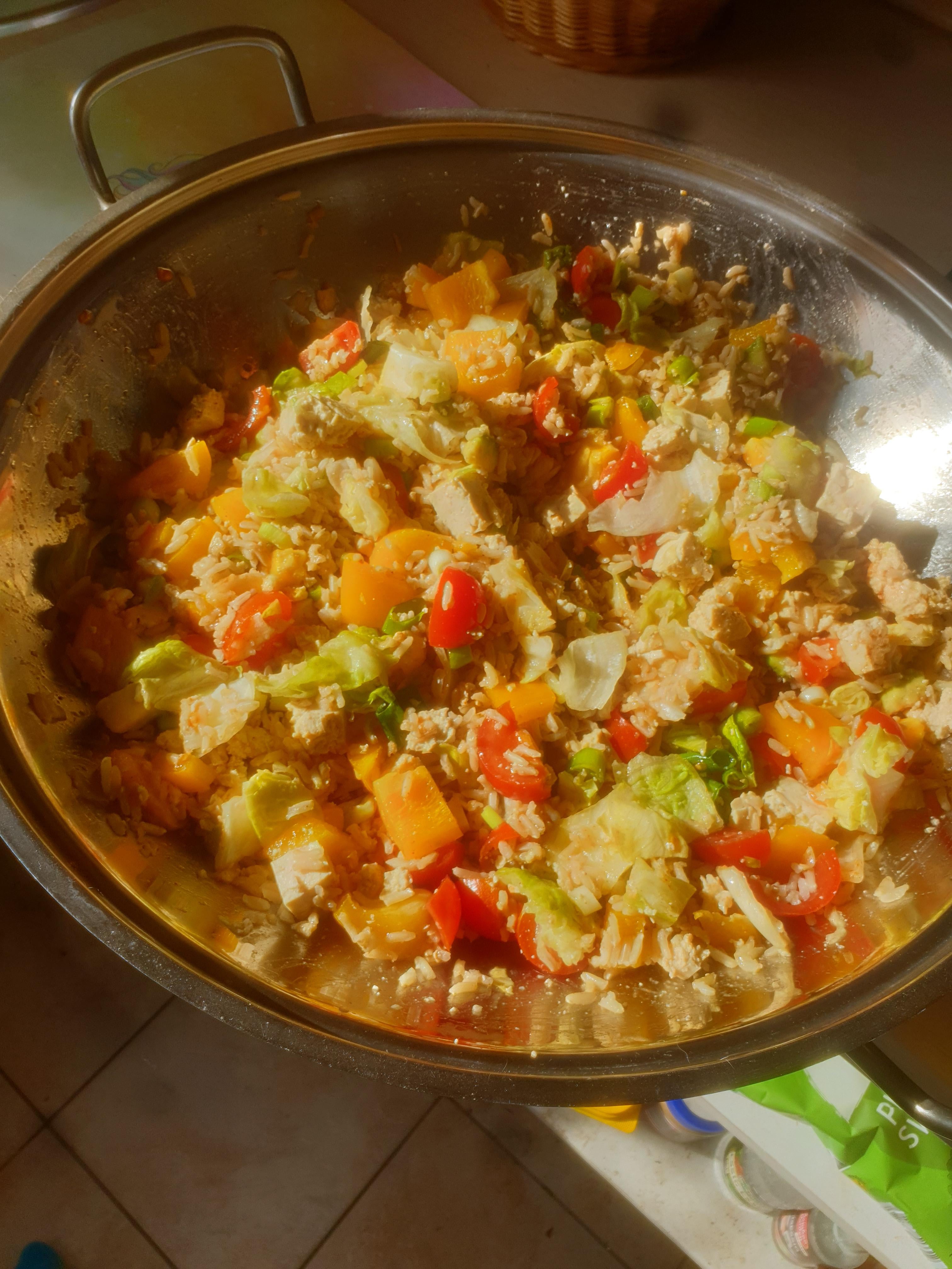 Vollkornreis, paprika, tomate, eisbergsalat, frühlingszwiebel, tofu, abartig viel knoblauch und döner sauce