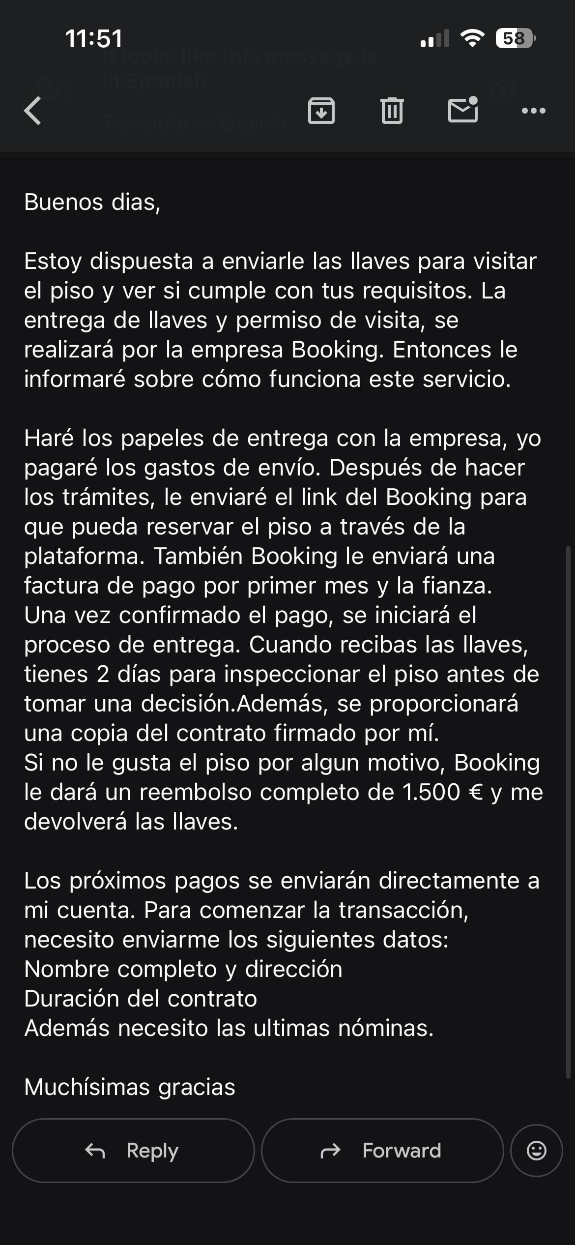 Wir sprechen mit diesem Besitzer und er hat uns Folgendes geschickt (E-Mail-Screenshot oben). Ich bin mir nicht sicher, ob wir es richtig übersetzen, aber es hört sich so an, als würden wir 1.500 € im Voraus zahlen, bevor wir den Mietvertrag überhaupt unterschreiben?