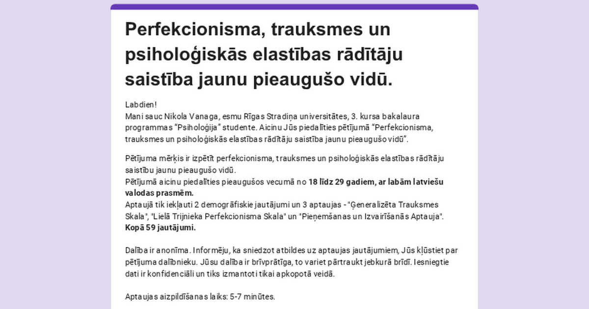 Hallo! Ich habe im Rahmen meines Bachelorstudiums geforscht "Der Zusammenhang zwischen Perfektionismus, Angst und psychischer Flexibilität punktet bei jungen Erwachsenen".