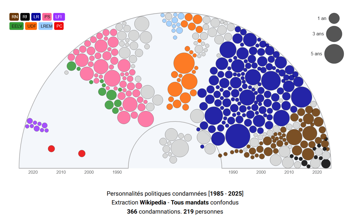 Pourquoi pas, mais la représentation en hémicycle de cette façon est un peu trompeur sur les proportions. Pourquoi un tel vide entre les Verts et LFI ? Si c’est pour représenter la composition actuelle de l’Assemblée, c’est trompeur en masquant le fait que forcément les partis historiques sont forcément bien plus représentés, le temps de commettre des délits et qu’ils soient sanctionnés par la justice (ce qui peut prendre bien trop de temps), et surtout que la plupart des infractions sont commises par des élus locaux.