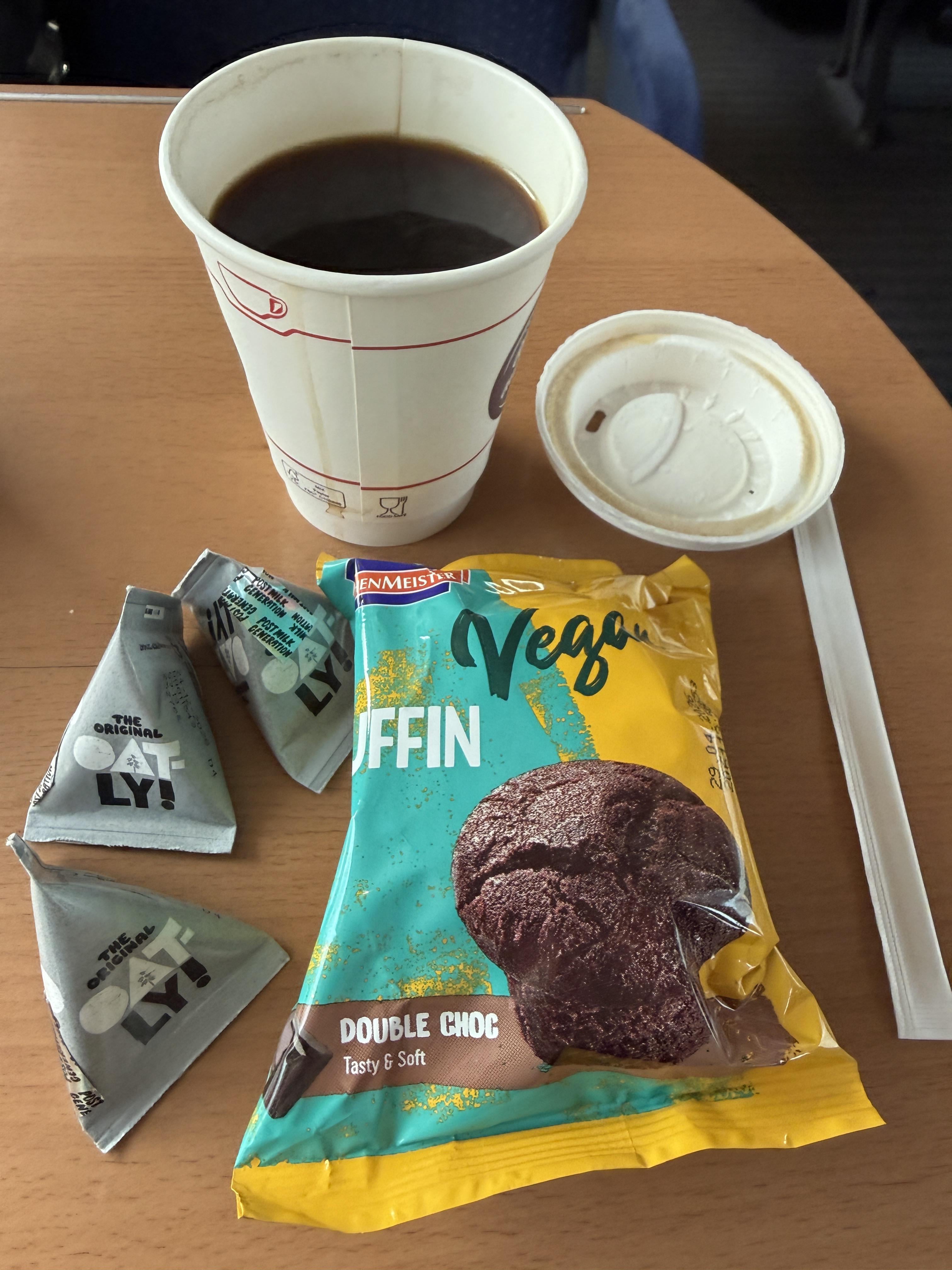 Da setze ich mich nichtsahnend in den Zug, da kommen sofort 2 liebe Mitarbeiterinnen mit Kaffee. Als sie mir dann noch einen veganen Muffin anboten, bin ich quasi dahingeschmolzen. Konnten sie Gedanken lesen oder waren sie nur gut im Verkauf geschult? 😉