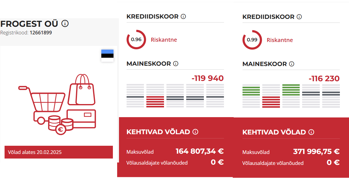 Seien Sie vorsichtig! Ende Februar machte Frog eine brutale Steuerschuld. Abgesehen von den beiden Unternehmen frogest OÜ (371.996,75 €) und frog store OÜ (164.807,34 €) beträgt die Gesamtsteuerschuld 536.804 Euro.