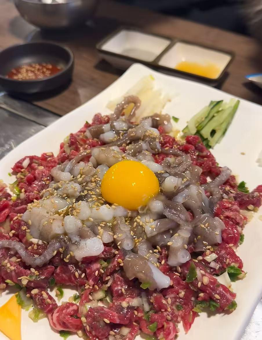 Ehrlich gesagt hatte ich zunächst etwas Angst davor, es auszuprobieren, vor allem mit dem rohen Oktopus und Eigelb. Aber am Ende war es überraschend lecker. Das Rindfleisch war super frisch und die Textur war wirklich interessant.