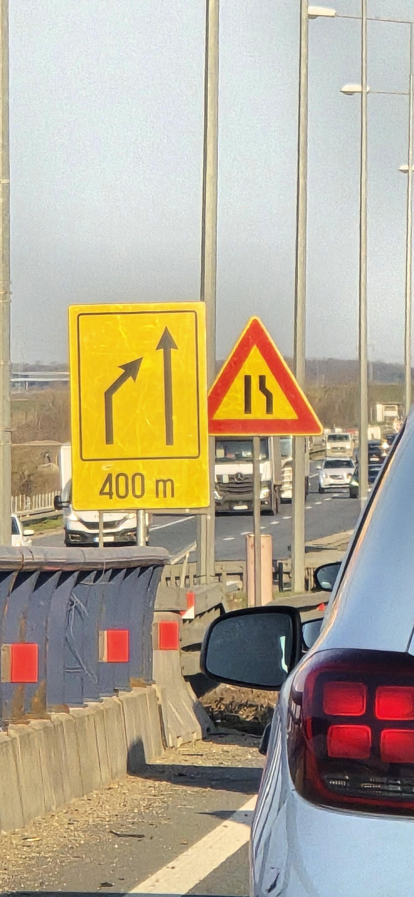 jedan znak ti je privremena signalizacija – radovi na putu – govori da se leva traka zatvara i priključuje se desnoj traci. a drugi znak je znak opasnosti – suženje putasa desne strane…💁♂️