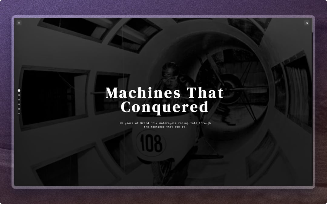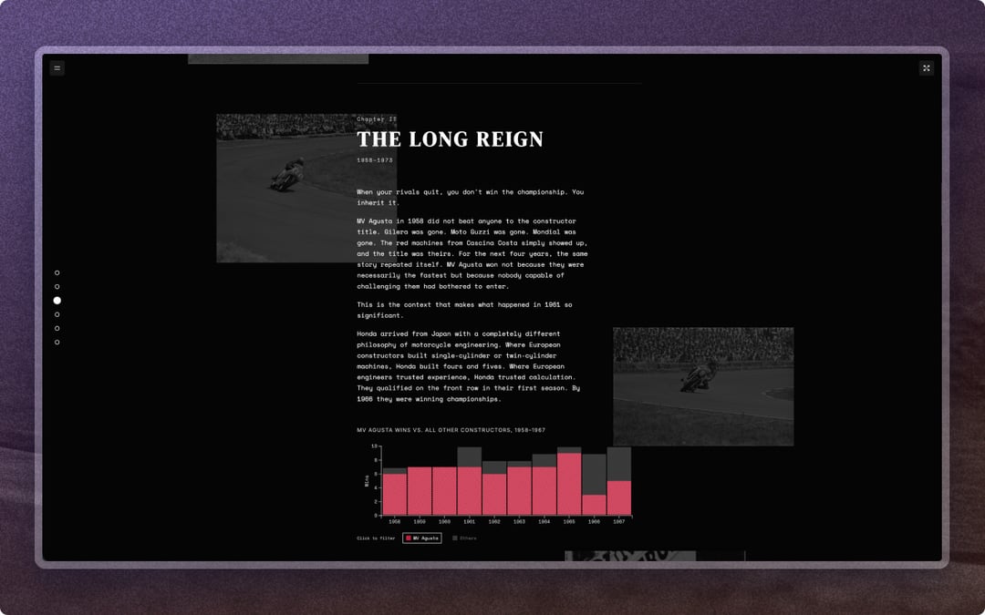 Es gibt auch eine narrative Story-Ebene mit fünf Kapiteln, die die wichtigsten Veränderungen abdecken: britische Maschinen in den 1950er Jahren, MV Agustas außergewöhnlicher Würgegriff in den 1960er Jahren, die japanische Industrieübernahme, der Kalte Krieg zwischen Honda und Yamaha und die moderne Ducati-Dynastie.