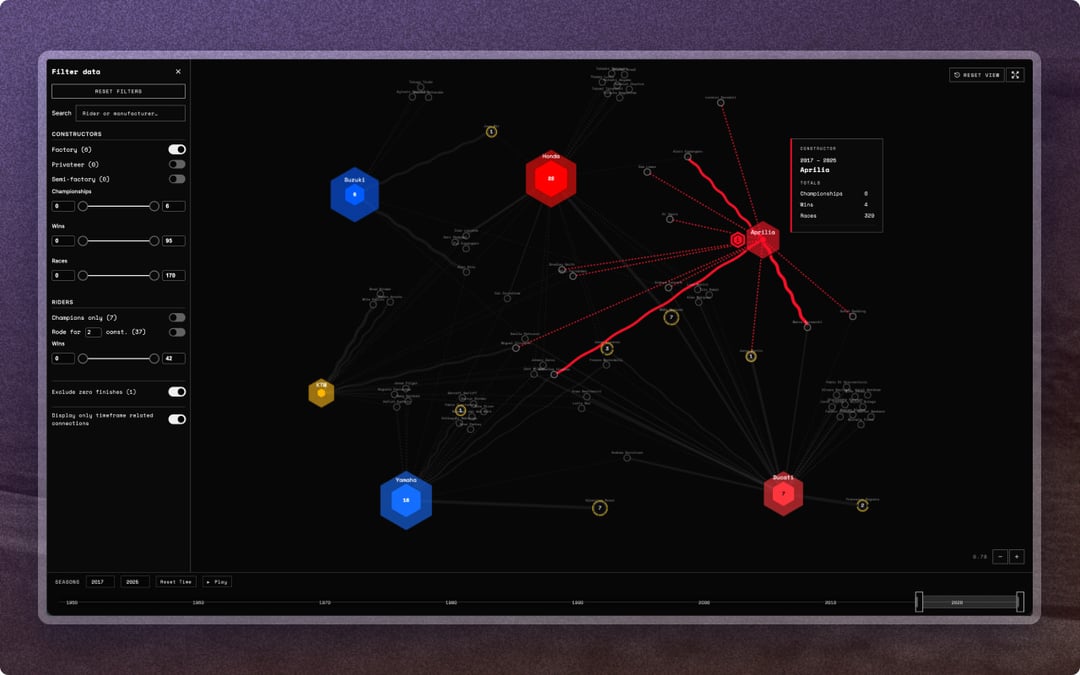 Der Explorer zeigt Daten aus ca. 75 Jahren an: jeder Konstruktor als Knoten (Größe nach Gesamtsiegen), jeder Reiter als kleinerer verbundener Knoten und jede Kante stellt die Beziehung zwischen einem Konstruktor und einem von ihm eingesetzten Reiter dar. Sie können nach Konstrukteuren filtern, auf einer Zeitleiste durch die Jahreszeiten scrollen und zusehen, wie sich das Netzwerk weiterentwickelt, während Zeiten der Dominanz auf- und absteigen.
