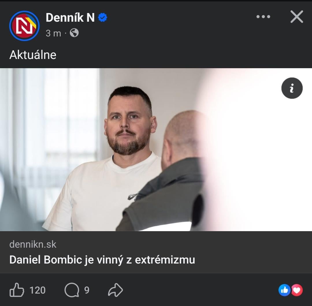 „Daniel Bombic je vinný z extrémizmu. Samosudkyňa Špecializovaného trestného súdu Eliška Šnajderová momentálne číta rozsudok. Voči rozhodnutiu súdu sa obhajoba zrejme odvolá. Rozhodovať by tak mal následne Najvyšší súd.“