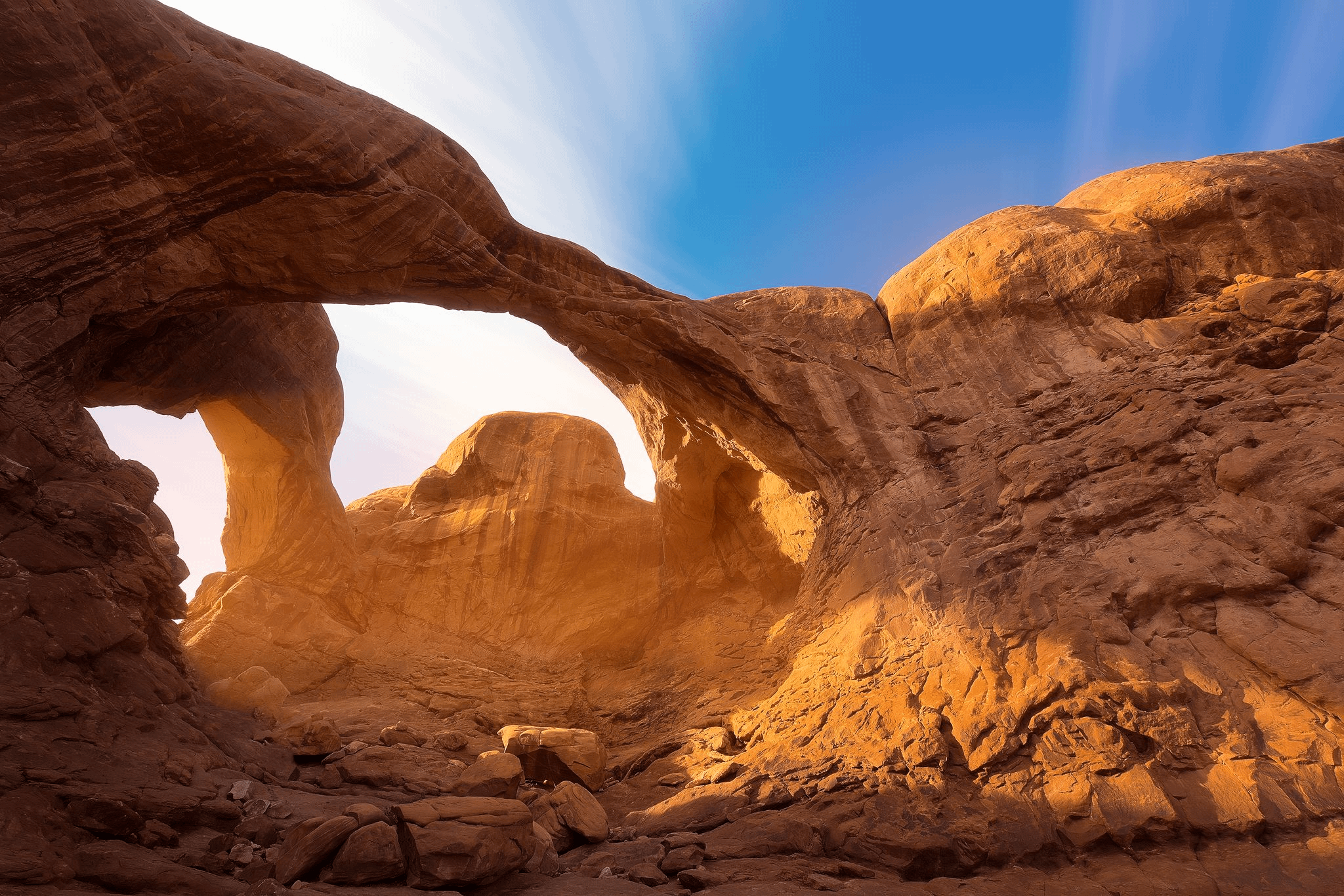 Mit einer Höhe von 112 Fuß bietet dieser Komplex aus ineinandergreifenden Bögen eine faszinierende Perspektive auf die Sandsteinerosion in der Wüste. Es ist ein Ort, an dem die Größe der Natur den menschlichen Maßstab auf seinen kleinsten Ausdruck reduziert.