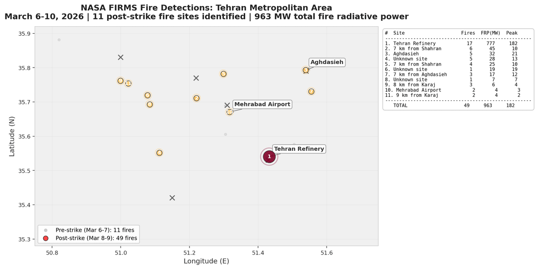 Die NASA betreibt ein System namens FIRMS, das mithilfe von Infrarotsensoren (VIIRS mit einer Auflösung von 375 m und MODIS mit einer Auflösung von 1 km) alle paar Stunden aktive Brände aus dem Weltraum erkennt. Es misst die Feuerstrahlungsleistung (Fire Radiative Power, FRP) in Megawatt – im Grunde wie viel Energie jedes Feuer abgibt. Vom 6. bis 10. März habe ich sämtliche Erfassungen im Großraum Teheran durchgeführt.