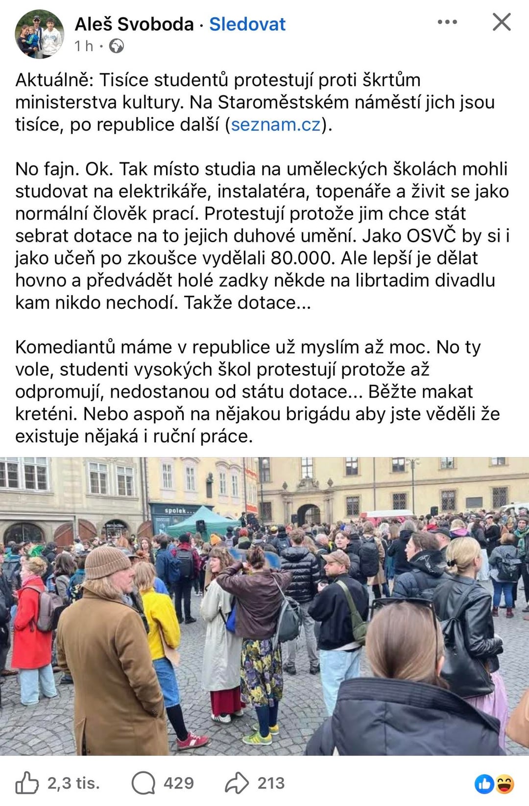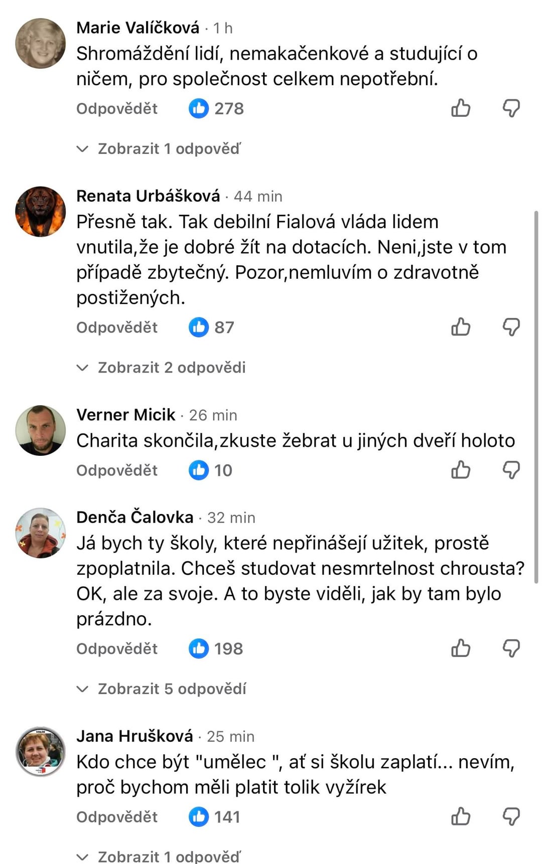 Jako sorry, ale pokud si mám vybrat, jestli ty peníze dát do třeba zdravotnictví nebo zemědělství na úkor toho, že si student AVU nebude moct čmárat po plátně a dělat performance, tak ta volba bude dost jasná. Při ustanovování priorit při rozdělování zdrojů pro mě bude ten umělec vždycky někde v posledních místech. Tak to prostě logicky bude.