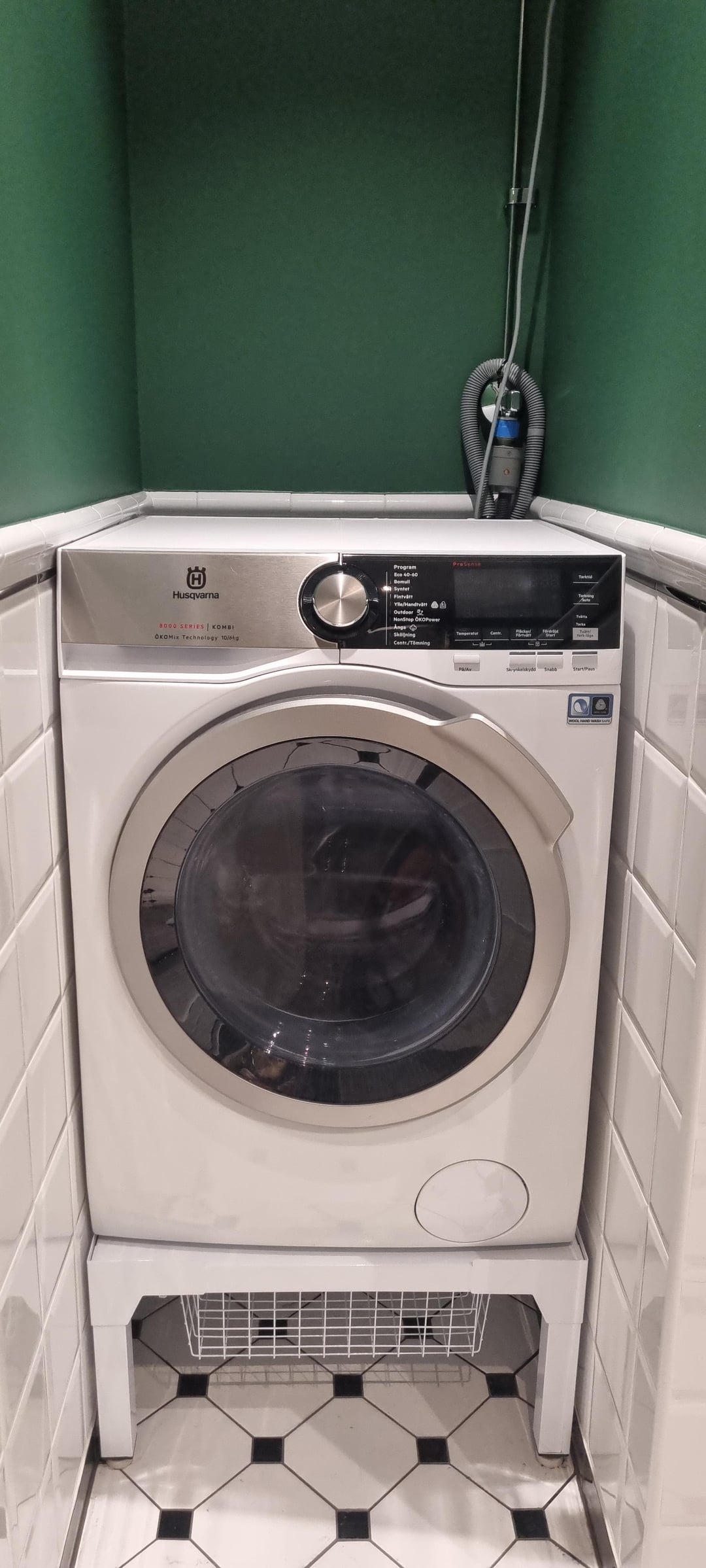 Testa att ta bort den där märkliga kröken som avloppsslangen gör ovanför tvättmaskinen och låt slangen ligga fritt bakom tvättmaskinen.