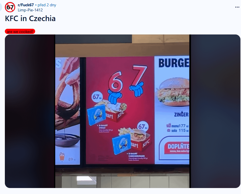 67 je tak cringe, až je to good… a hlavně hrozně moc lidí to nesmyslně nasírá tím, jak debilní/surrealistické to je 😀 pak tu jsou tyhle korporátní mrdky, které se snaží prostě naskočit na rozjetý vlak a „šplhnout si u mládeže“ a tím ze sebe jen udělají dementy
