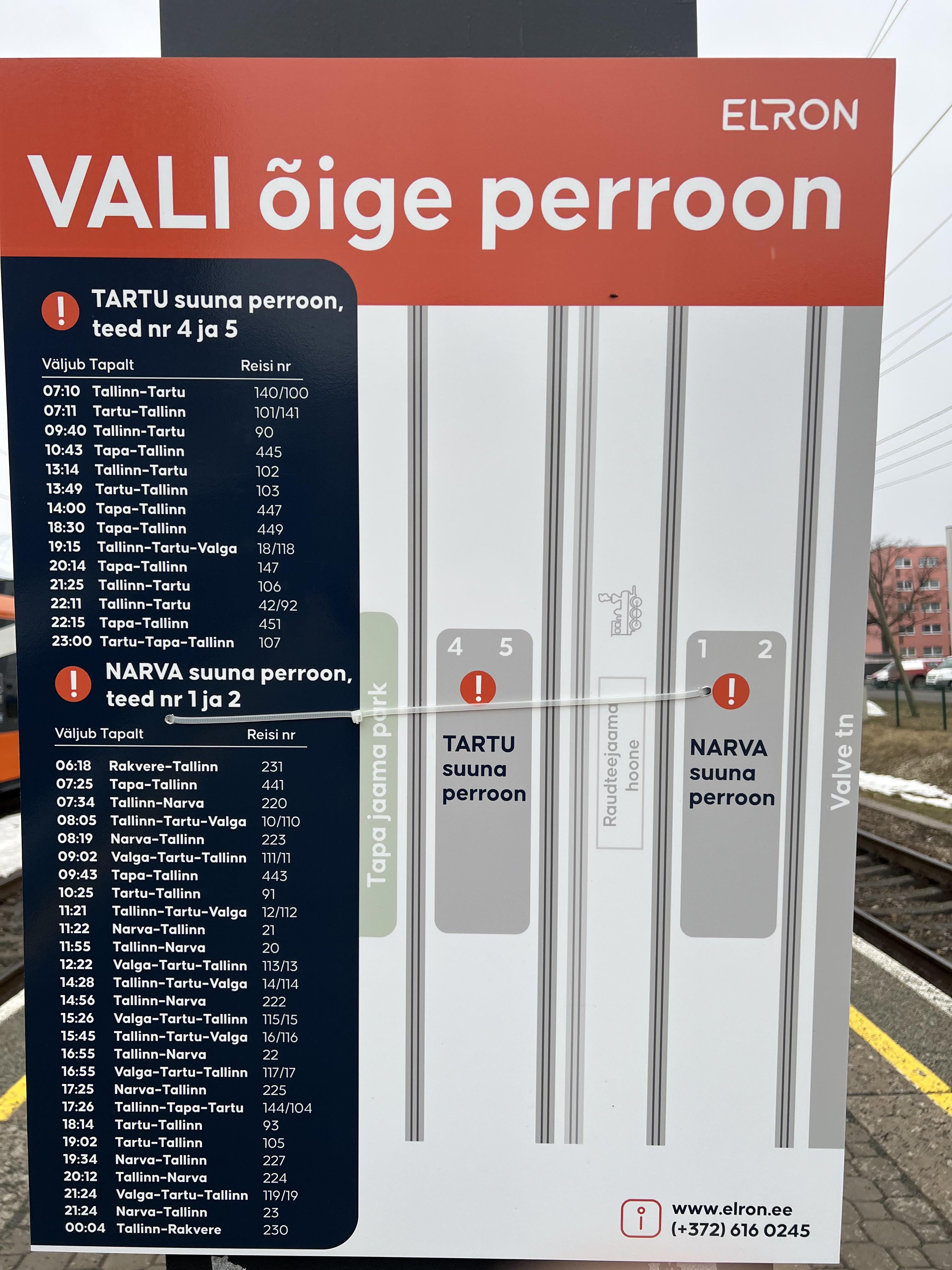 Bevor die Eisenbahnarbeiten in Tapa durchgeführt wurden, verkehrten Tartu-Züge auf den Gleisen 4 und 5 und Narva-Züge auf den Gleisen 1 und 2, und es war sehr leicht zu verstehen, zu welchem ​​Gleis ich gehen musste, aber jetzt verkehren die Hälfte der Tartu-Züge auf den Gleisen 1 und 2, sodass Sie nicht mehr einfach überprüfen können, ob es sich um einen Tartu- oder Narva-Zug handelt, sondern Sie müssen nach dieser Flagge suchen und sehen, zu welchem ​​Gleis Sie gehen müssen