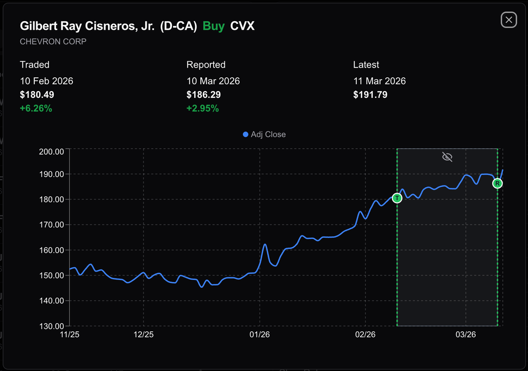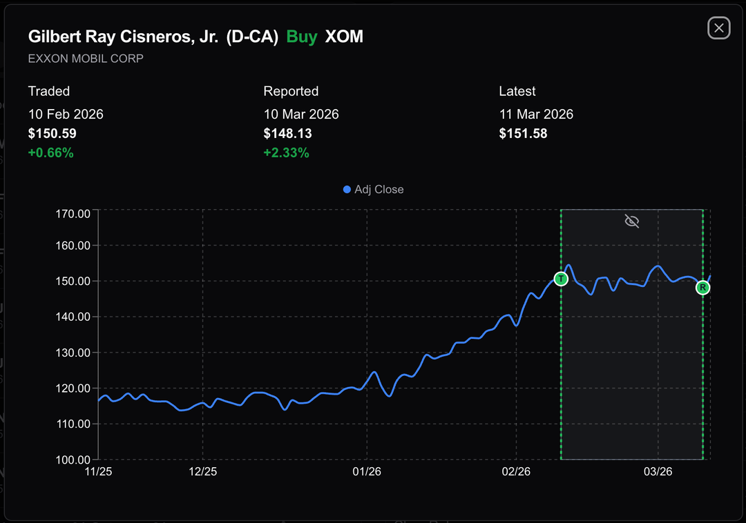 Data source: [https://disclosures-clerk.house.gov/public_disc/ptr-pdfs/2026/20033762.pdf](https://disclosures-clerk.house.gov/public_disc/ptr-pdfs/2026/20033762.pdf) (Exxon & Chevron buys) and his past financial disclosures.