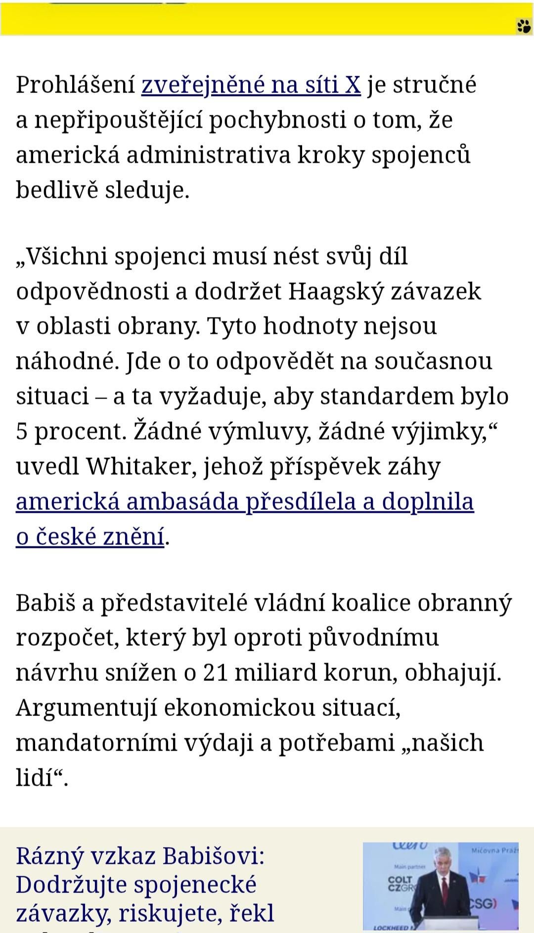 Der US-Botschafter bei der NATO lehnt Babišs Ausnahmen ab