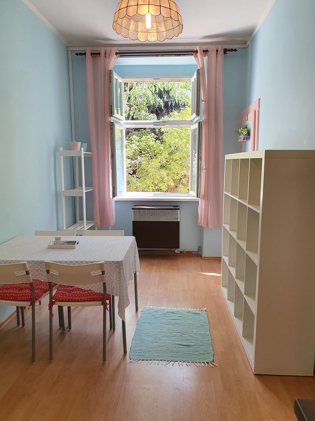 Barevná kombinace modrá a růžová, co tam máš teď, se mi líbí, pokud i tobě, tak bych se osobně naklonila tomu se inspirovat nějakými “female living space”, kde mají bydlení ženy orientované na jemné pastelové barvy se spoustou svěžích dekorací, jako třeba obrázky ovoce, kulaté funky rámečky, květináče, atd.