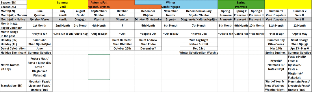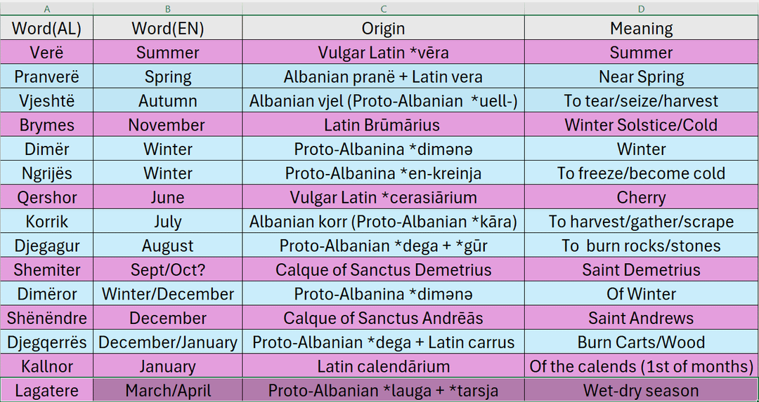Ich war neugierig auf die Etymologie der einheimischen albanischen Monatsnamen, die nicht auf Albanisch ausgeliehen/kalkuliert sind, also wollte ich sie darlegen, um zu sehen, wie sie optisch aussehen würden. Oben stehen die Jahreszeiten und in den grauen Kästchen die einheimischen/archaischen Namen der Monate. Viele der Monate können sich überschneiden und Sie werden den Dezember zweimal bemerken, während der November vor einem von ihnen liegt. Dies ist auf die vielen in der Region eingeführten Kalender zurückzuführen (römische, julianische, gregorianische, möglicherweise auch vorrömische).