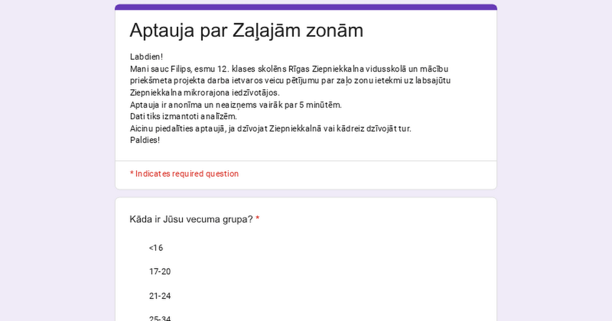Hallo, ich bin ein Schüler der 12. Klasse am Ziepniekkalns-Gymnasium und ein Fachschüler "Projektarbeit" Im Rahmen dessen habe ich eine Studie über die Auswirkungen von Grünflächen auf das Wohlbefinden im Bezirk Ziepniekkalns durchgeführt. Bitte füllen Sie den Fragebogen aus, wenn Sie Zeit und Lust haben. Dank im Voraus!