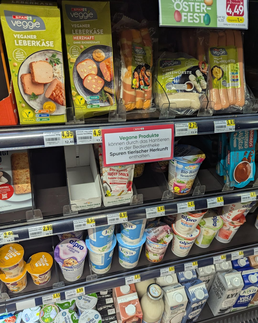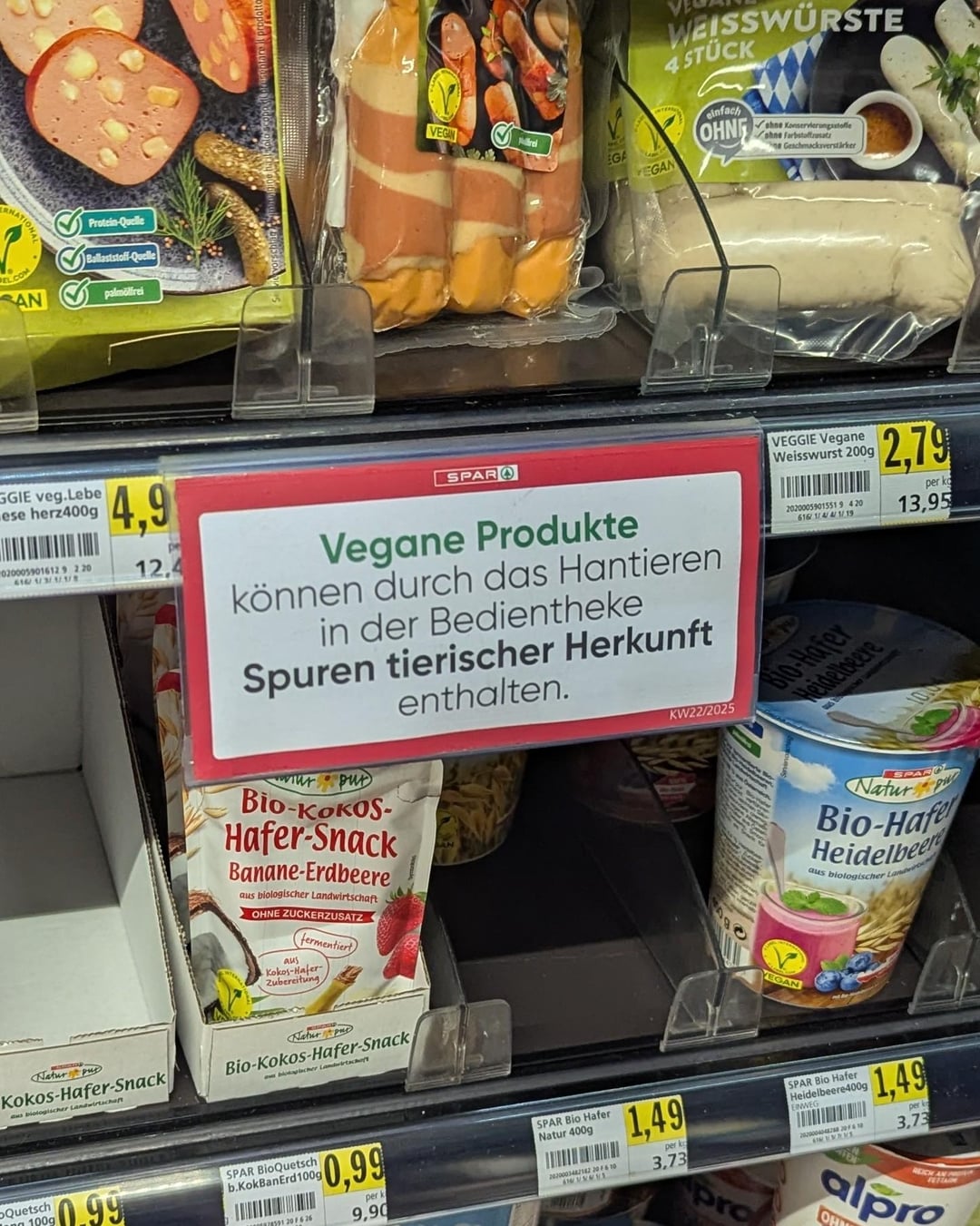 Das Schild ist an der falschen Stelle angebracht. Gehört eigentlich zur Frischteke wo man auch vegane Leberkäs- oder Schnitzelsemmeln bekommt.